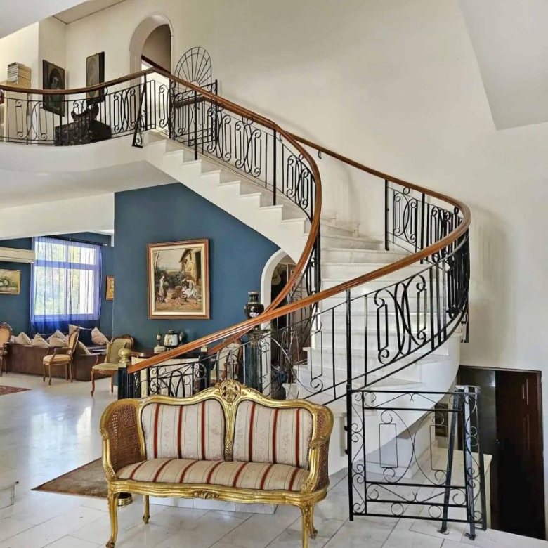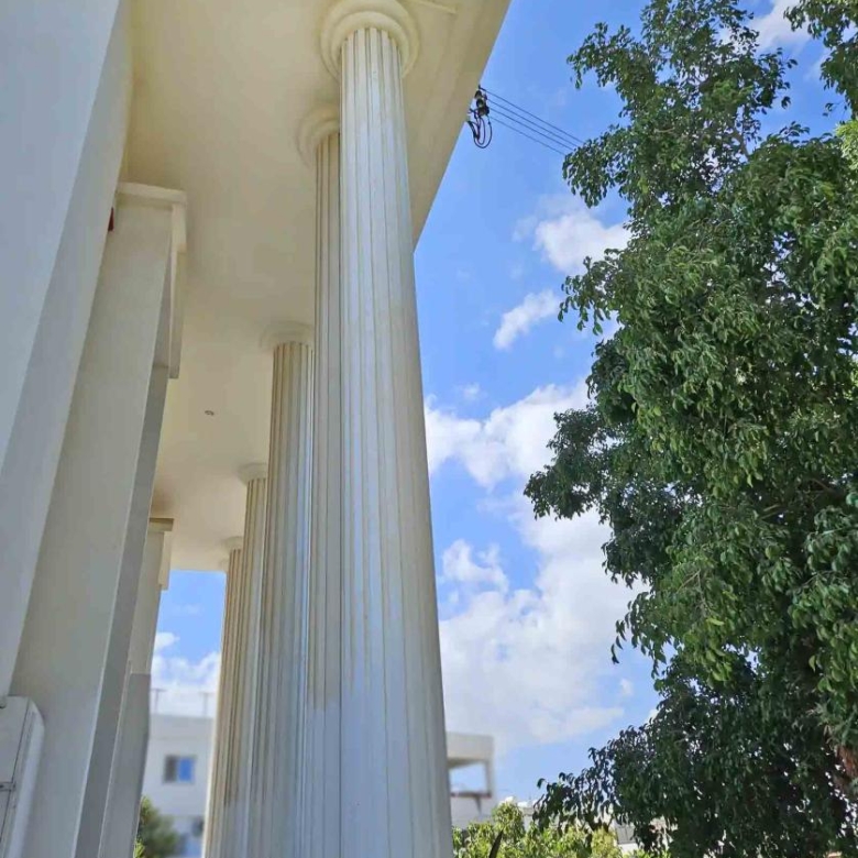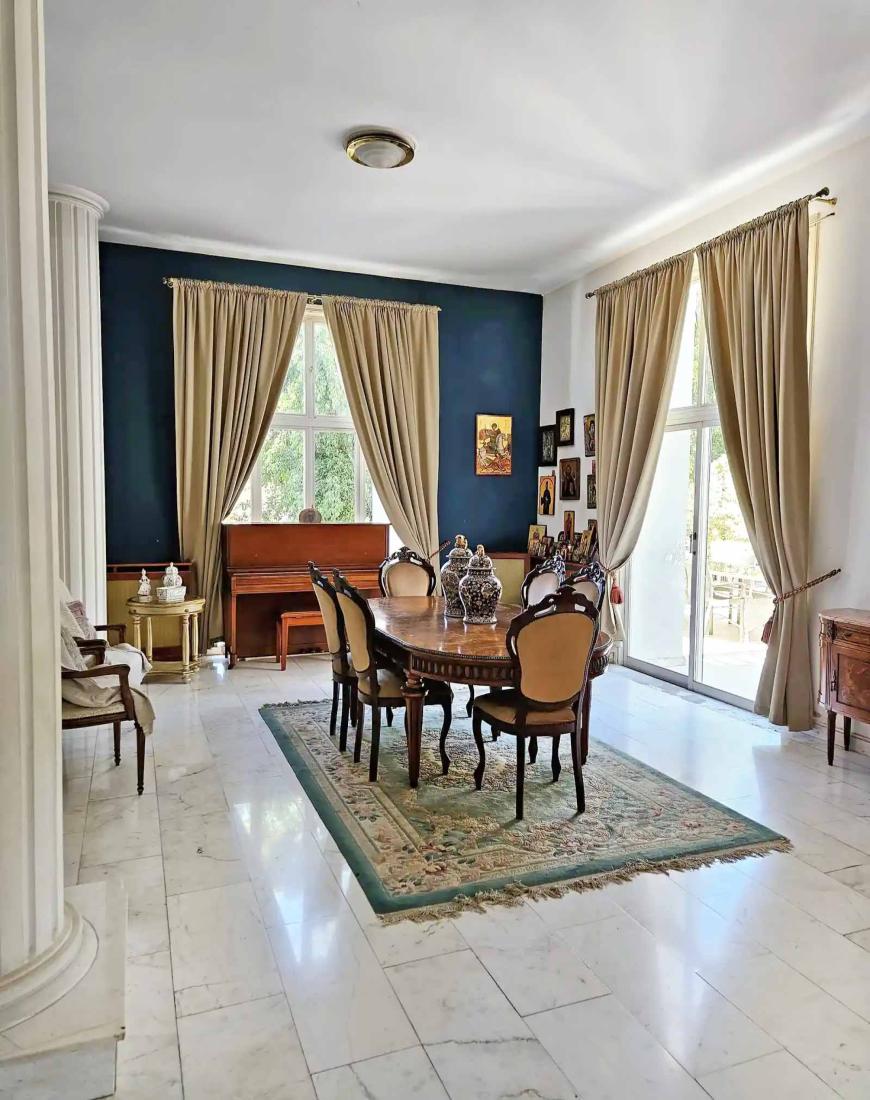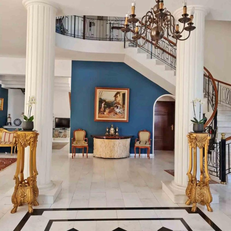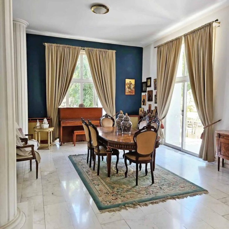 This luxurious residence is located in one of Larnaca’s most exclusive and safest areas, offering privacy, proximity to the airport, and views of a park and salt lake. The house is 1050m² across three levels and sits on a 939m² plot. The basement includes three large offices, a workshop, a bathroom, two WCs, a domestic staff room with a kitchen and shower, and a gym. The ground floor features an open-plan living room with access to the garden, pool, Jacuzzi, and pool house, as well as a kitchen, dining area, and storeroom. It also contains a private apartment with its own entrance, living room, kitchen, and large bedroom with en suite bathroom. On the first floor, there are four bedrooms. The master bedroom has a dressing room, en suite bathroom, and private terrace. Two other bedrooms also have en suite bathrooms, while the fourth shares a bathroom. An office area connects to a large veranda with park views. The home is equipped with air-conditioning and central heating throughout.