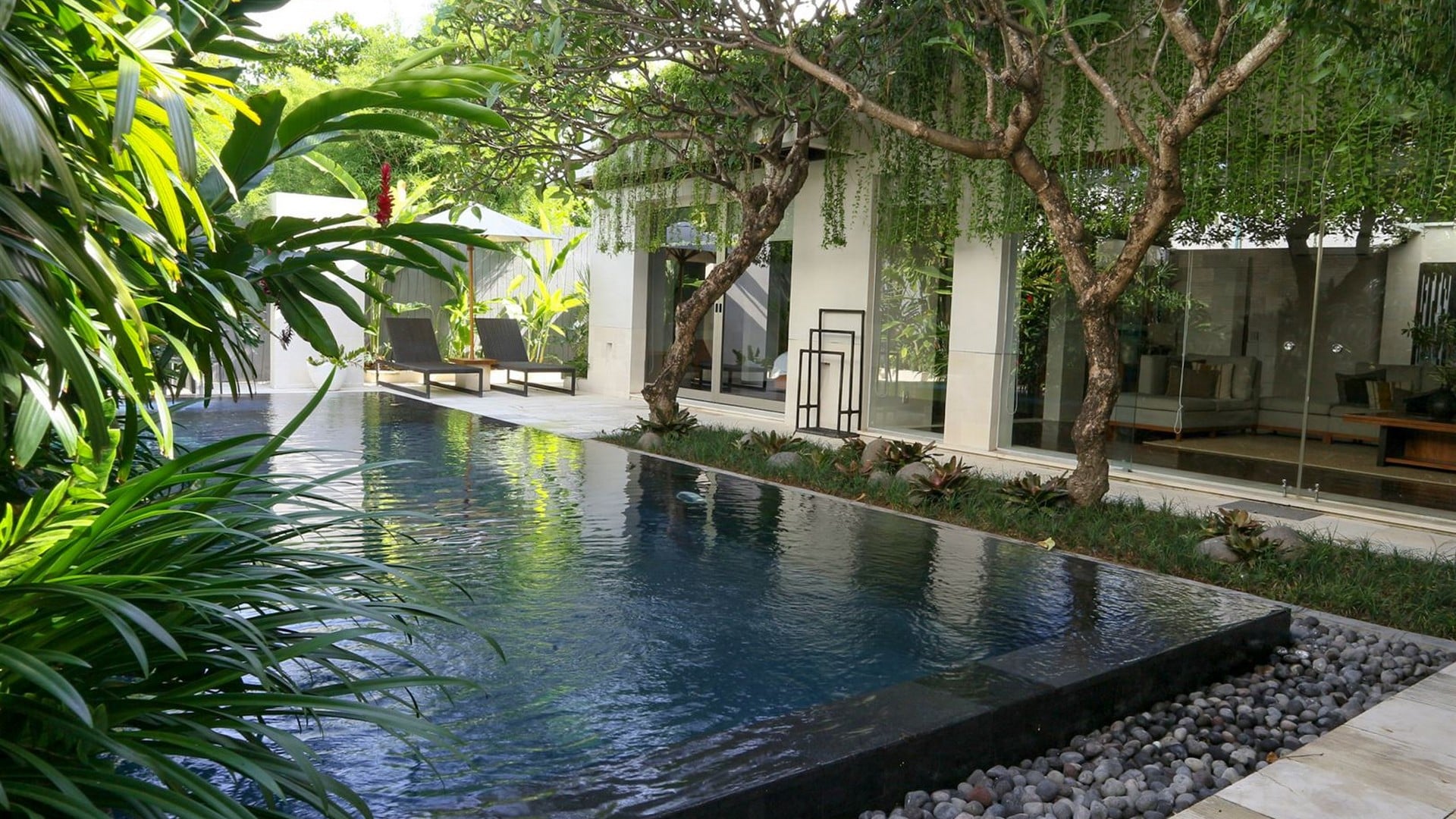 The elegant villa offers 3 spacious & stylish bedrooms suites, fitted western kitchens with indoor dining areas, while generously scaled living areas lead out to a private 10 meter lap pool sat in mature tropical gardens. Ideal for entertaining as well as relaxing in a beautiful, tranquil environment, this iconic property is strategically located within Jimbaran’s most luxurious residential estate, just a stone’s throw from the pristine golden sands of Jimbaran Bay.