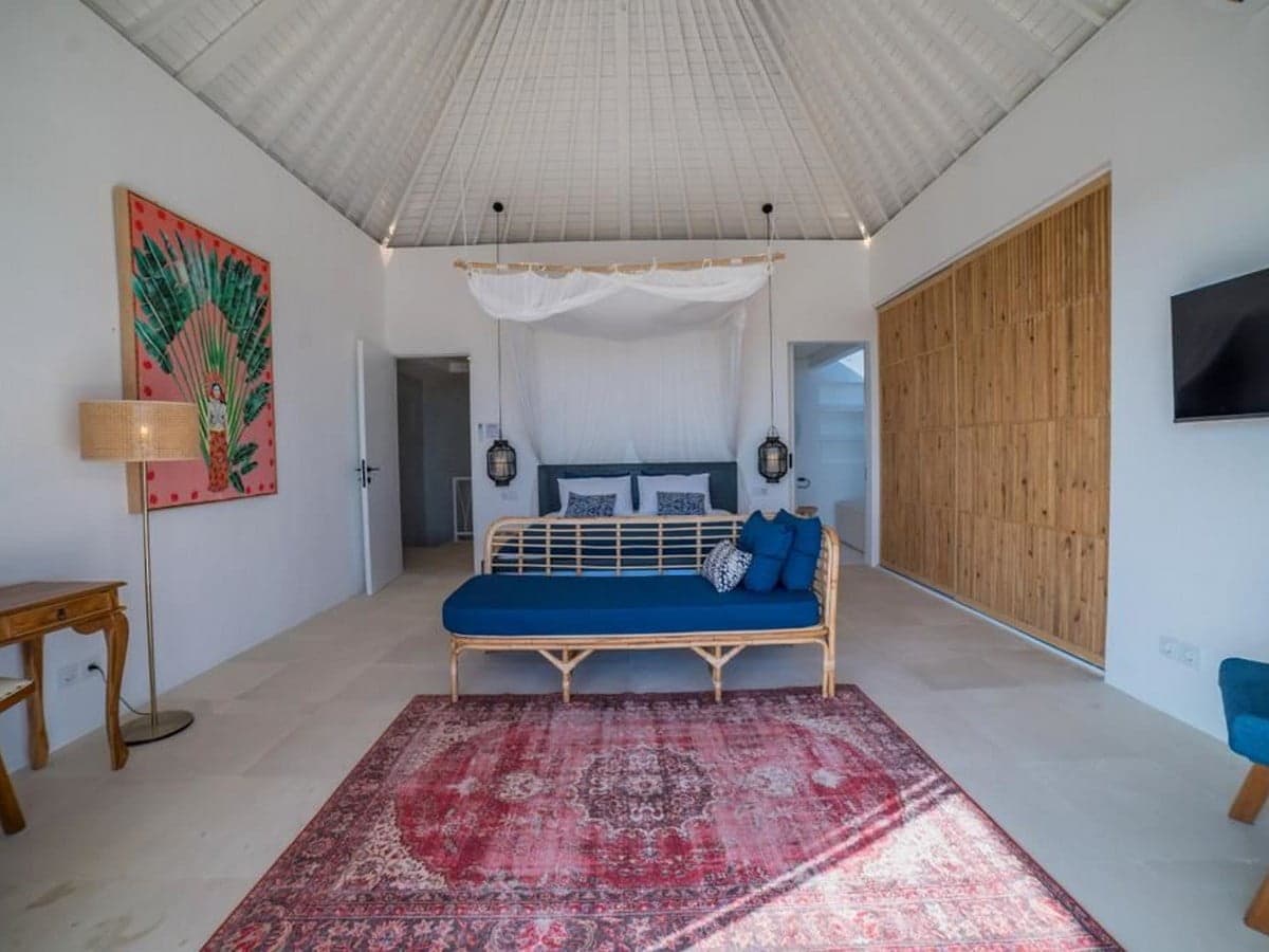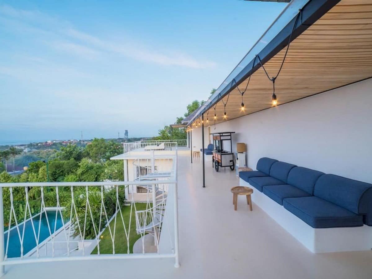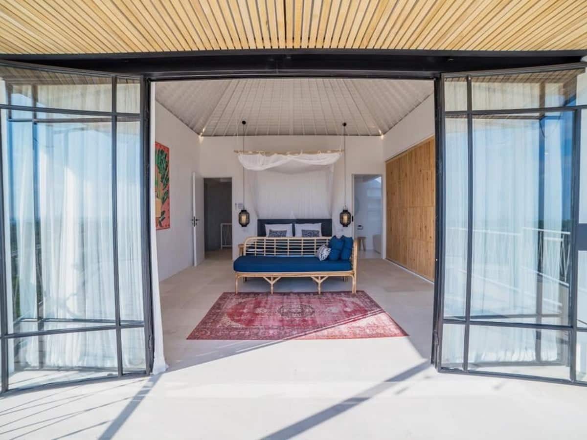 The stunning property is built to the highest standards and is surrounded by other luxury villas and lots of greenery. The entrance of the villa is recognizable by the art on the wall. Stepping inside you will find a large living room with a fully equipped modern kitchen, billiard table and lounge area. The living room can be opened entirely or closed off with large glass folding doors ensuring airflow throughout. There are two rooms on the ground floor and the third bedroom has bunk beds that kids would love. On the second floor you will find two identical master bedrooms—king-size beds, 42-inch TVs and ensuite bathrooms with bathtubs. There is a massive balcony that connects both rooms. On a clear day, you can see Java and the volcanoes of Bali. The villa comes fully furnished.