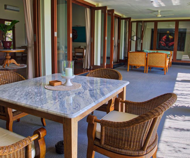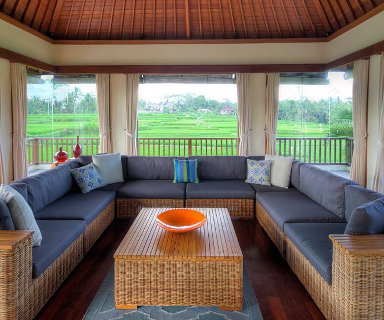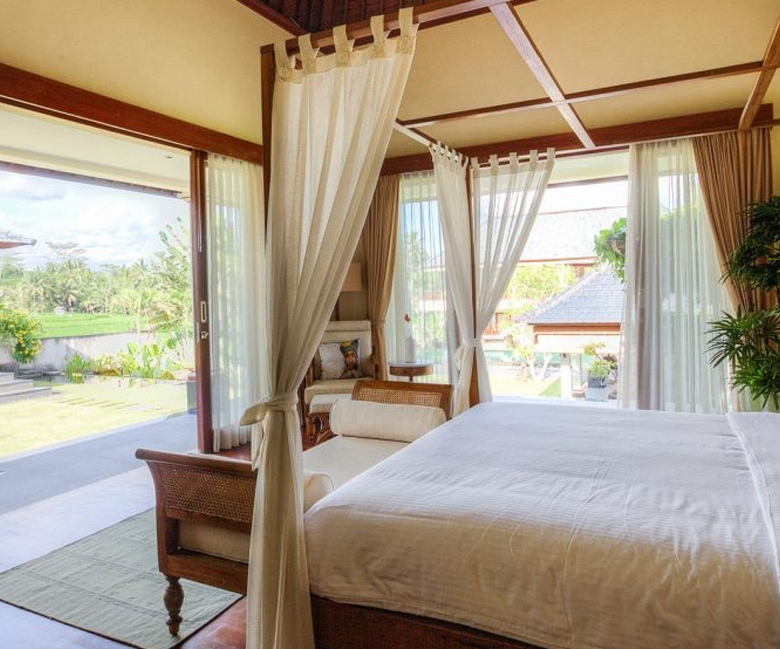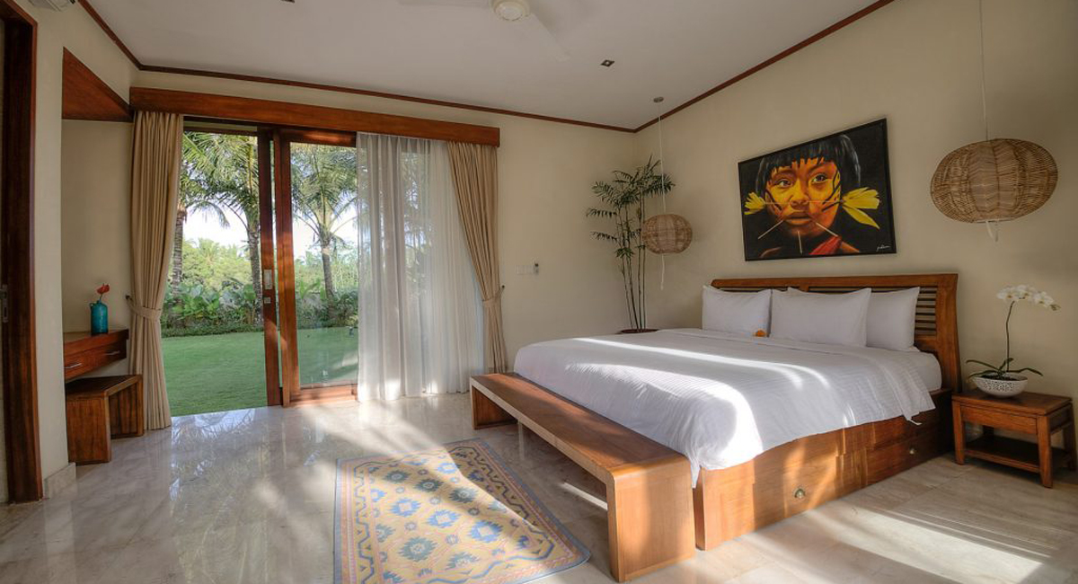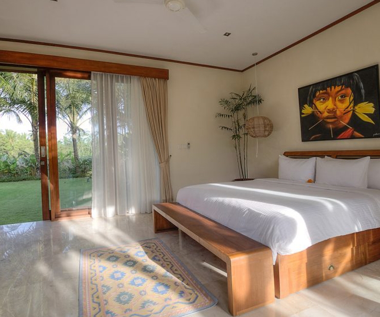 The villa boasts four spacious bedrooms, each with its own ensuite bathroom featuring a tub, rain shower, and sink, ensuring comfort and privacy for all occupants. The expansive living room provides a seamless flow to the dining area, which opens up to stunning rice field views, creating an atmosphere of elegance and relaxation. The fully furnished interiors reflect a sophisticated contemporary style, with carefully selected furnishings that complement the villa’s grand scale.