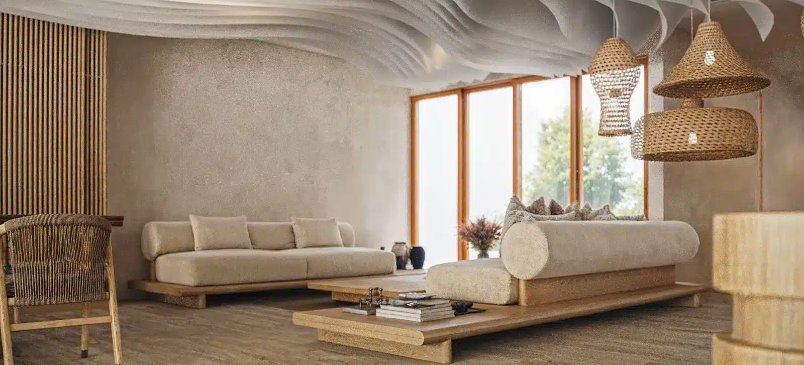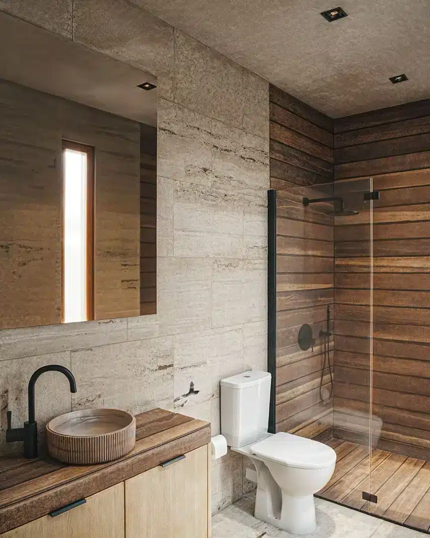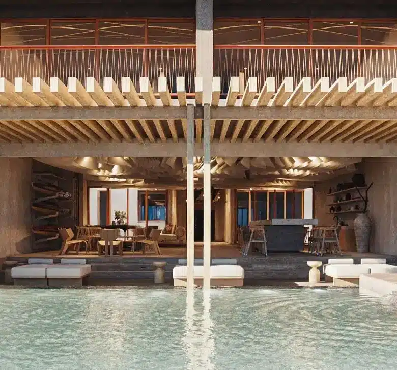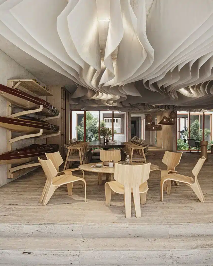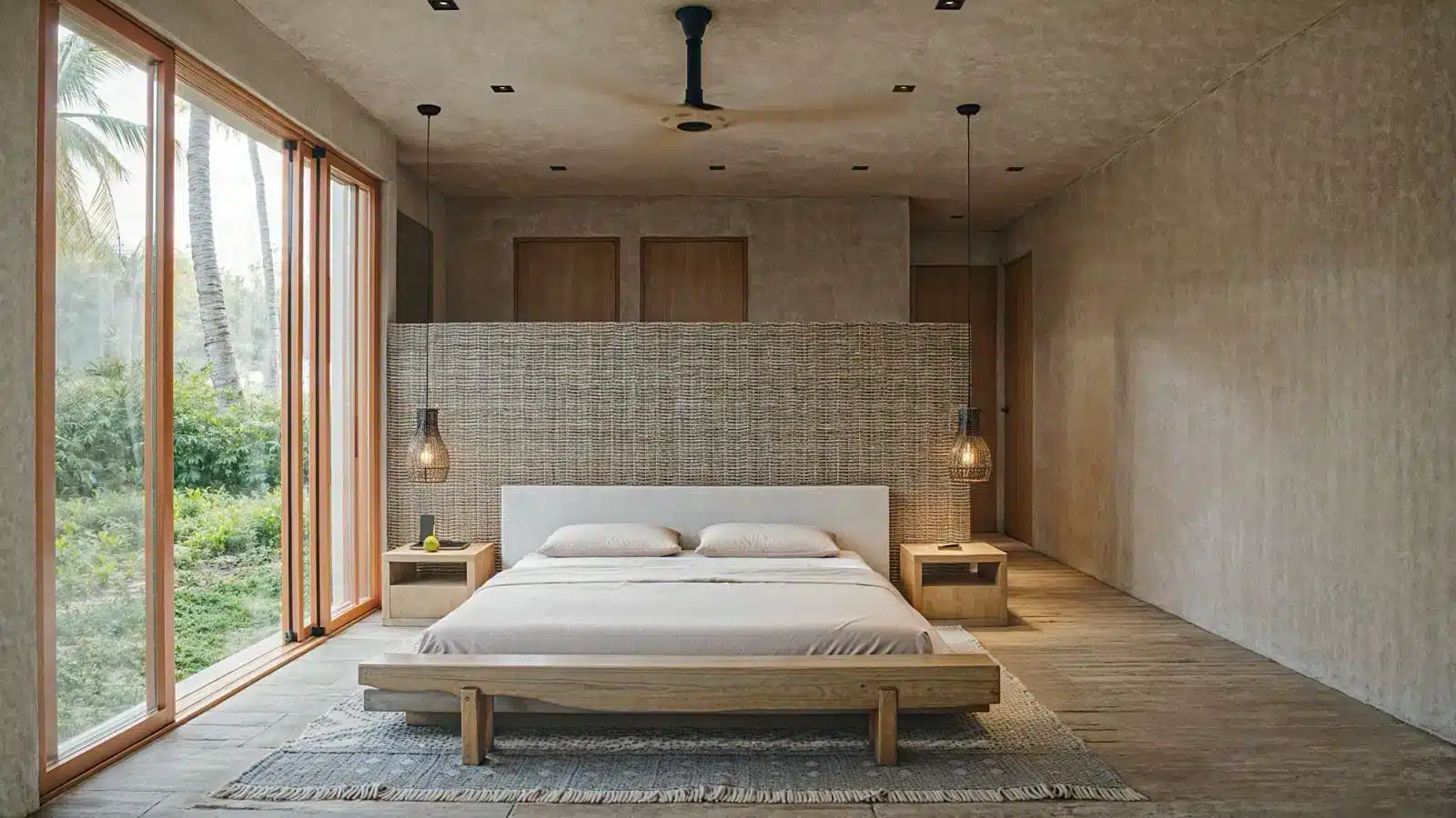 Interior materials include natural travertine marble, beige granite countertops, and tropical hardwood cabinetry, paired with elegant touches like yute-accented walls and matte black fixtures. Every detail is selected to reflect the surrounding landscape and promote a sense of calm and connection.