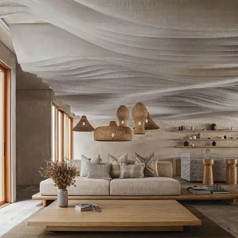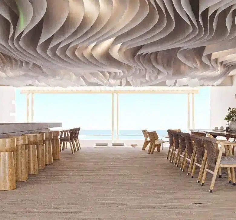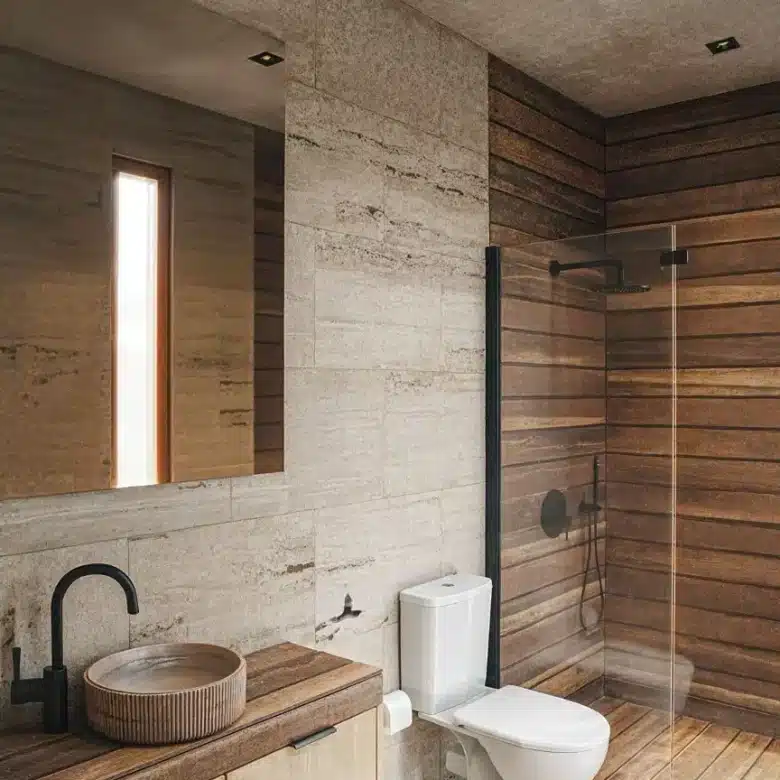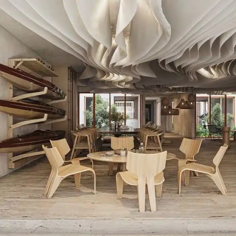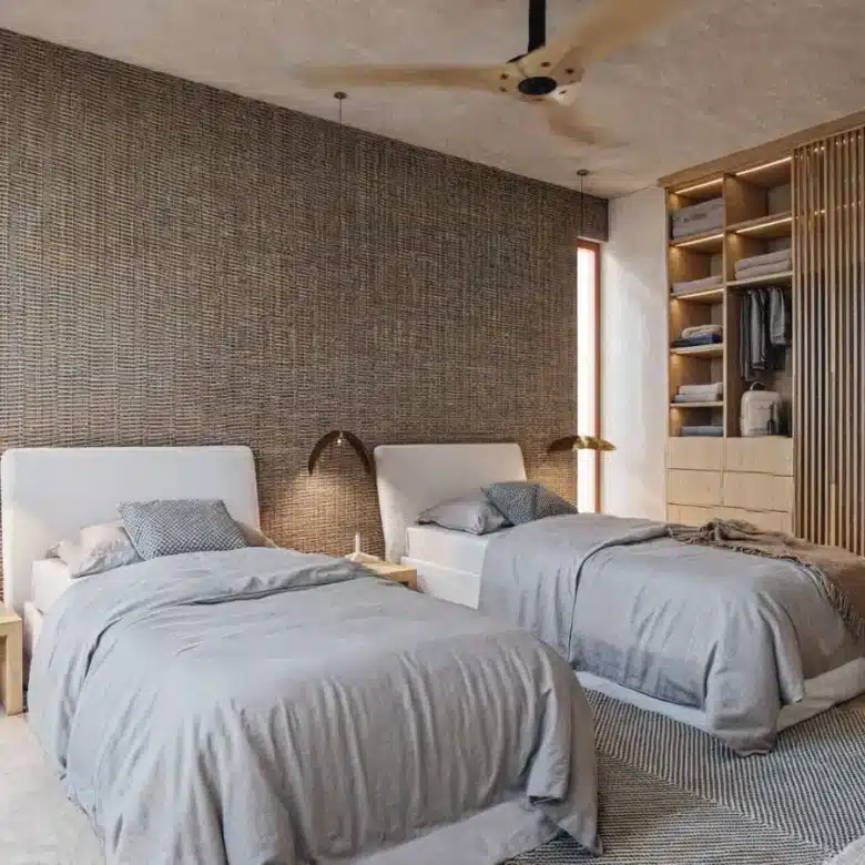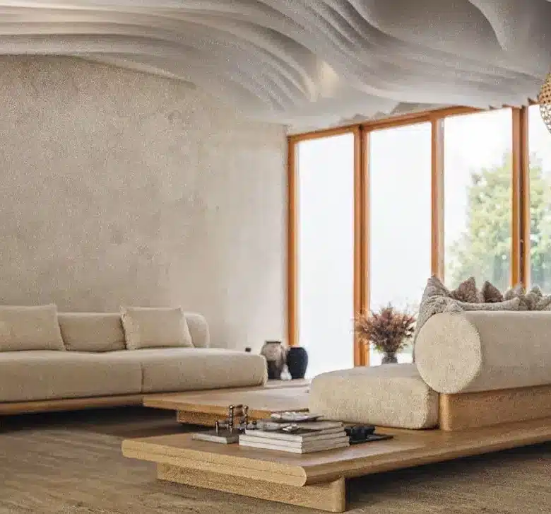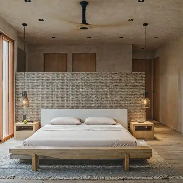 Interior materials include natural travertine marble, beige granite countertops, and tropical hardwood cabinetry, paired with elegant touches like yute-accented walls and matte black fixtures. Every detail is selected to reflect the surrounding landscape and promote a sense of calm and connection.