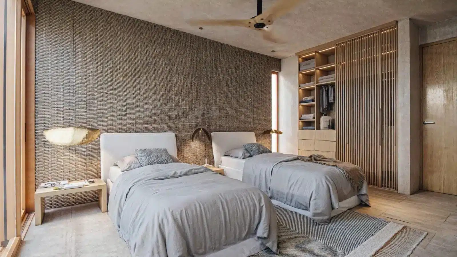 High ceilings and wide sliding doors create a seamless indoor-outdoor flow, filling the home with natural light and sea breezes. The primary suite opens directly to the terrace, while the secondary bedrooms offer generous space and privacy.