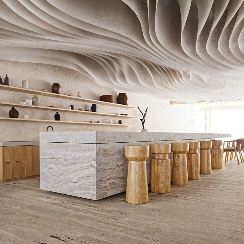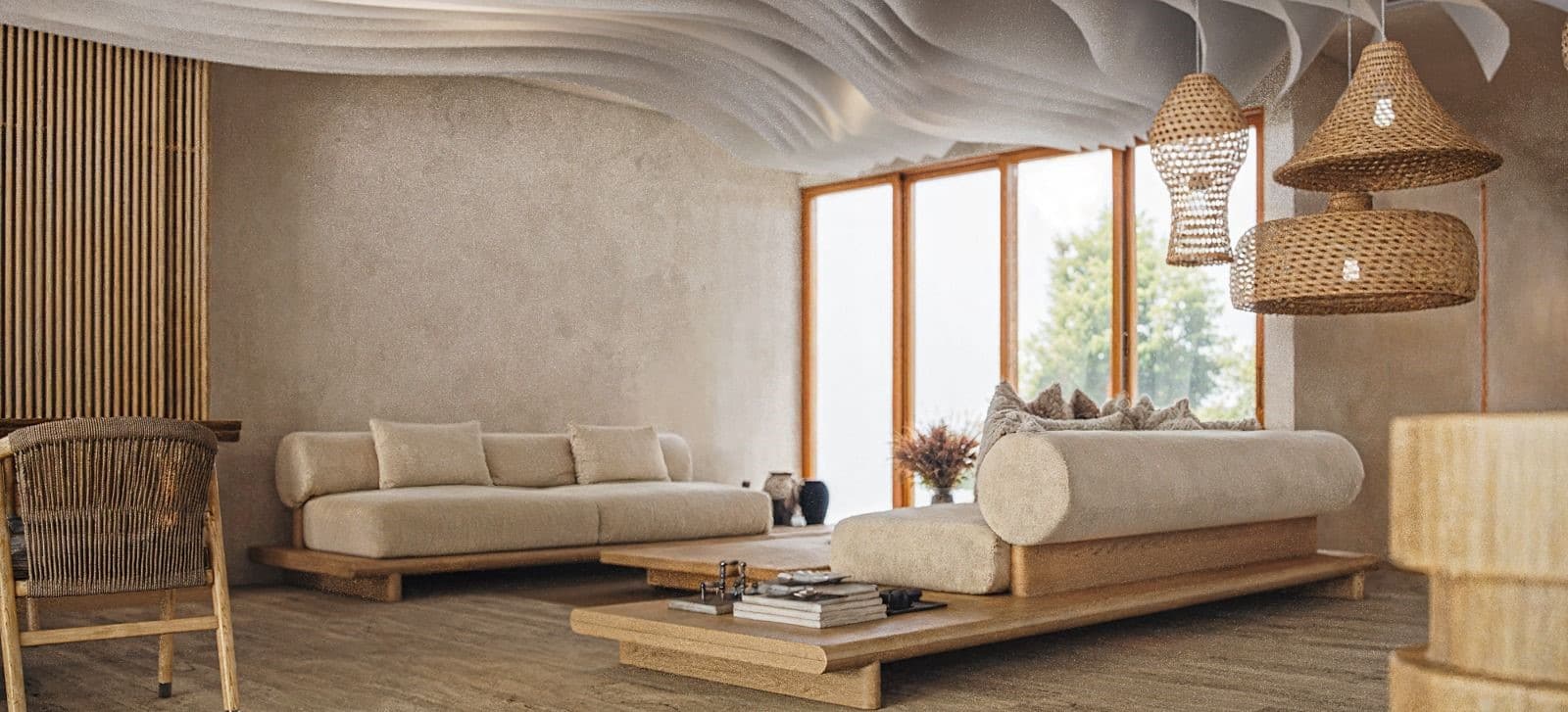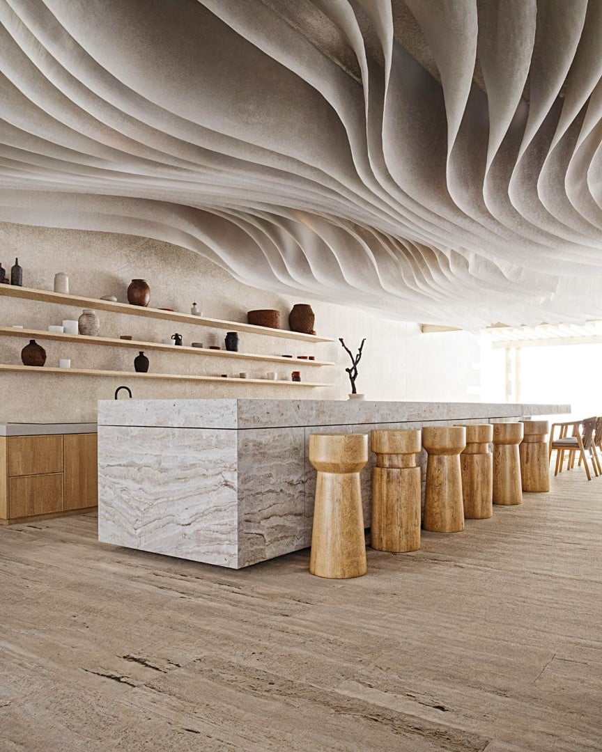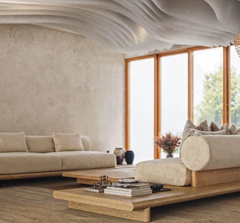 Finishes include travertine marble flooring, beige granite countertops, and custom cabinetry made from light-toned tropical wood. Soft textures like yute-accented feature walls and matte black fixtures add understated sophistication.