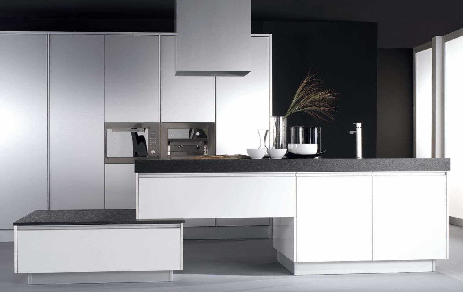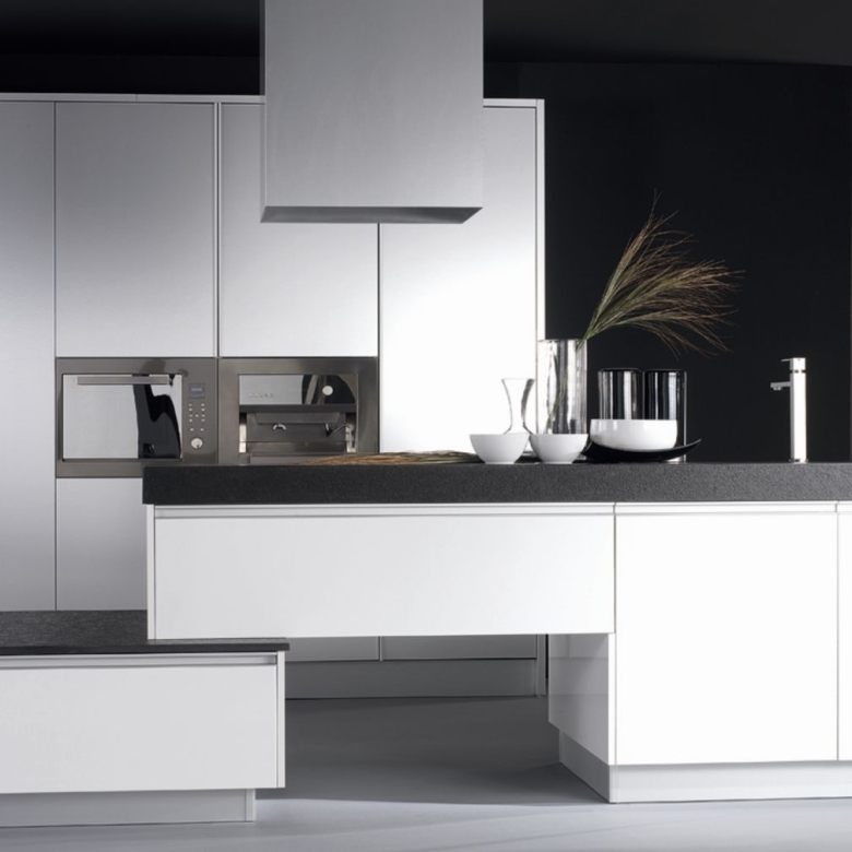 The kitchen is designed in a modern style with high quality appliances. Next to the kitchen there is a laundry room and a pantry hidden behind a door integrated into the kitchen design.