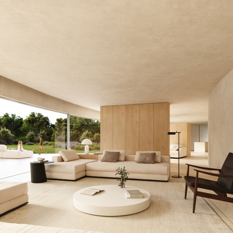 You will find the kitchen at yuor left side when you enter into the spacious, luminous living room with sea views already from the dining table and to the enormous terrace with it s chil out area in the left corner and the glass certains who make it the warmest place in th e winter from that covered terrace with the best sea views and south orientation.