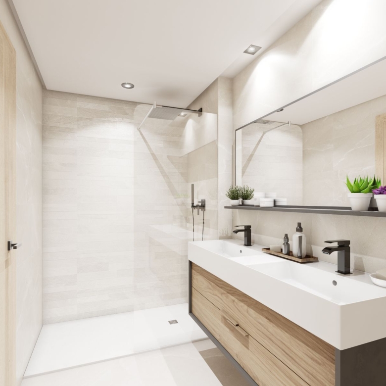 The apartment features a modern open-plan kitchen flowing seamlessly into the living and dining area, creating a bright and sociable living space. Comfort is ensured year-round with air conditioning and double-glazed windows throughout.