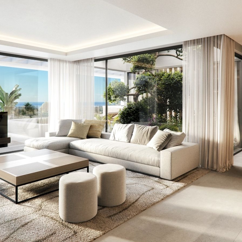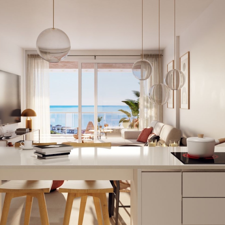 Step inside to an open-plan living and dining area with a fully fitted kitchen seamlessly integrated into the space—ideal for modern living. The lounge opens out onto a sunny south-facing terrace, offering partial pool views and lovely green garden surroundings, perfect for morning coffee or evening relaxation.