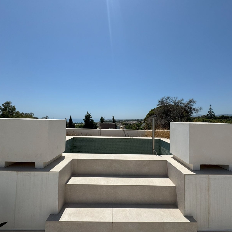The apartment boasts a generous sunny terrace with stunning sea views. Upon entering, you are welcomed by a hallway that leads to the dining and living area, which opens onto the terrace. The fully integrated kitchen is seamlessly connected to the living space.