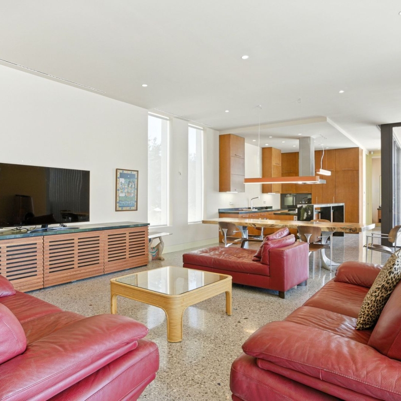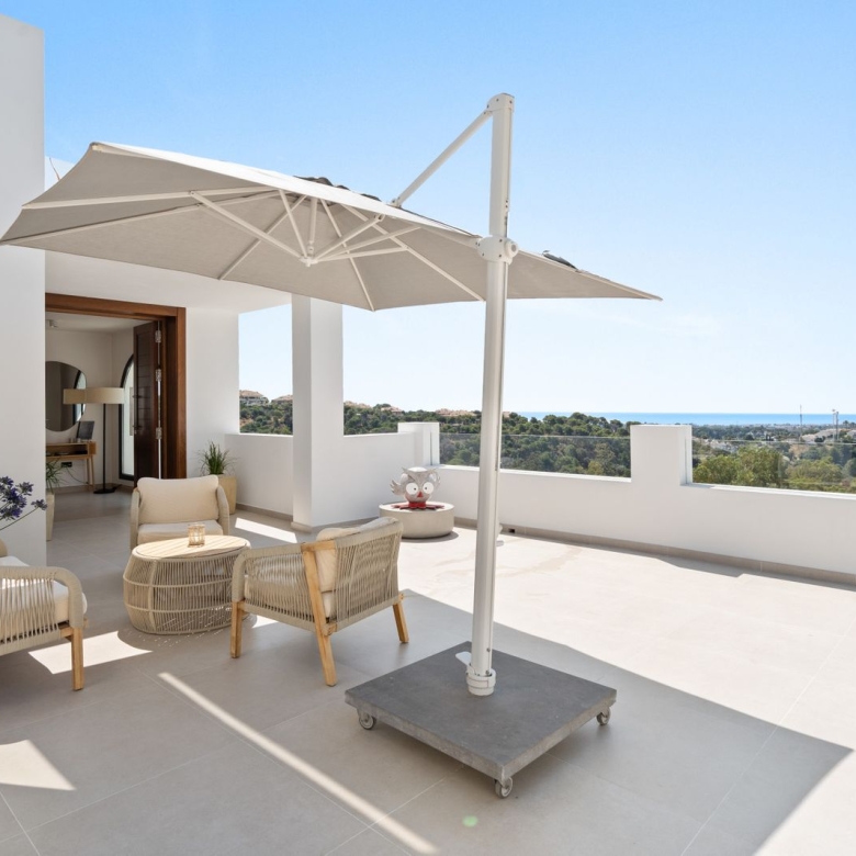 The apartment has a large living area leading to the covered terrace looking out to the sea and to the beautiful gardens and extra large lake like pool.