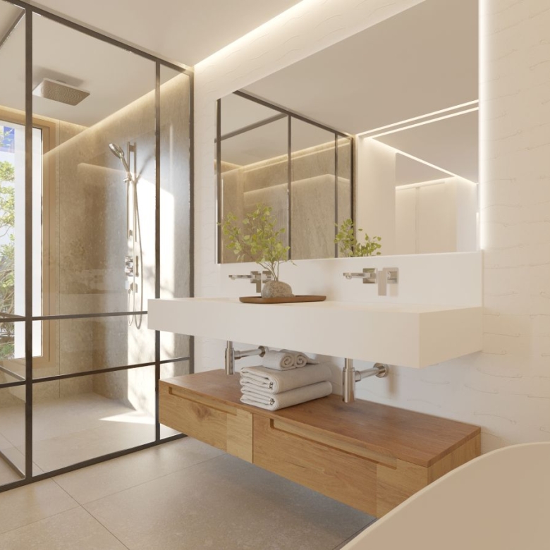 The property offers 82 m² of well-utilized space. The bright and spacious living-dining room opens onto a private terrace with urban and mountain views. Large windows flood the space with natural light, creating a warm and welcoming atmosphere throughout the day.