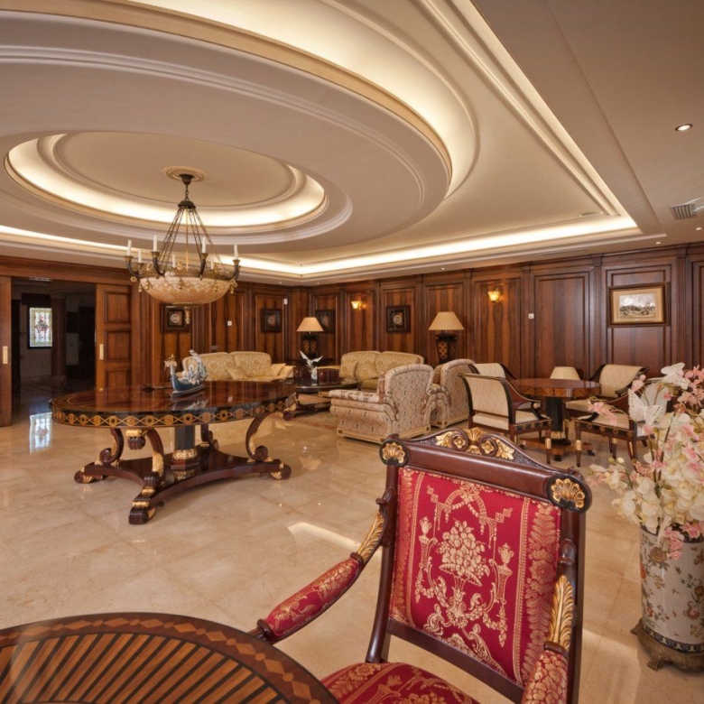 There are two fully equipped kitchens, one of which connects to the living space, offering a practical layout for family living or entertaining.