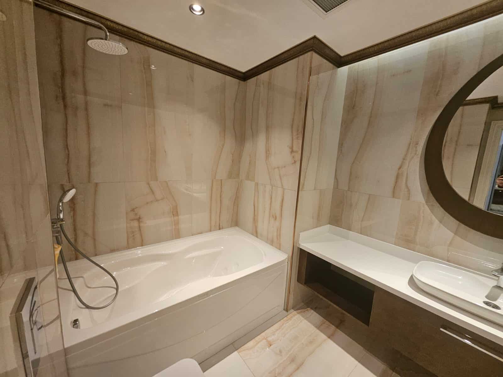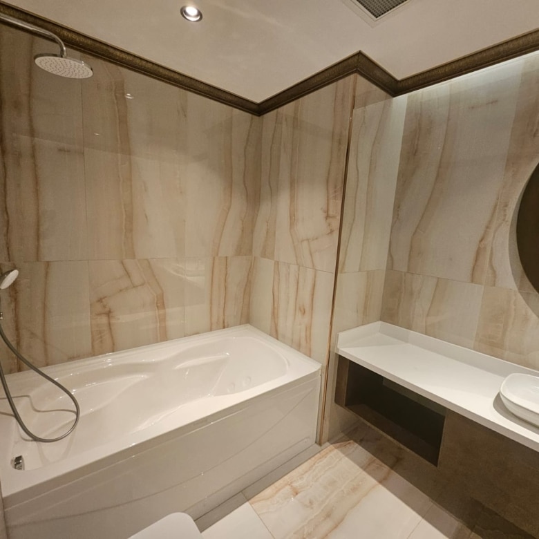 The apartment features a thoughtfully designed layout with two modern bathrooms including a luxurious jacuzzi, and two spacious balconies providing ample outdoor space to enjoy the magnificent sea views and pleasant Mediterranean climate.