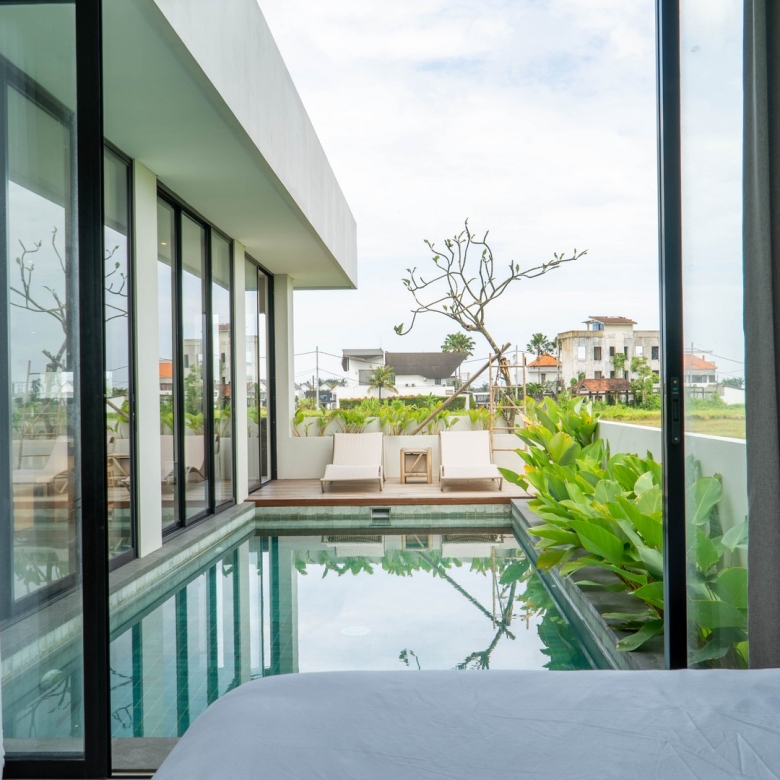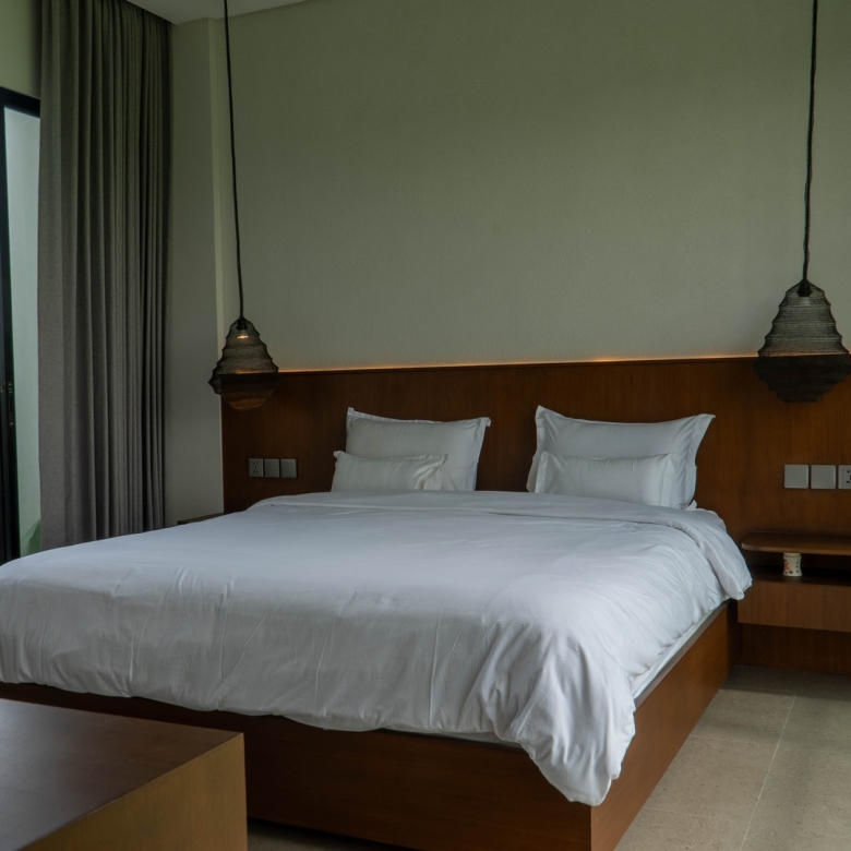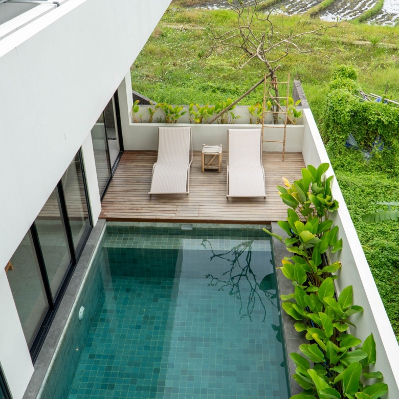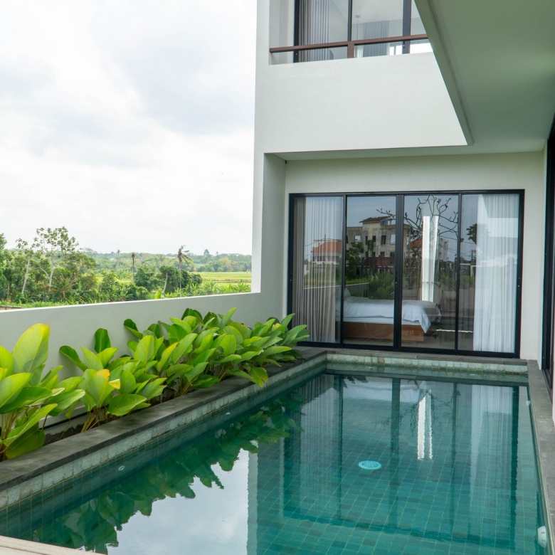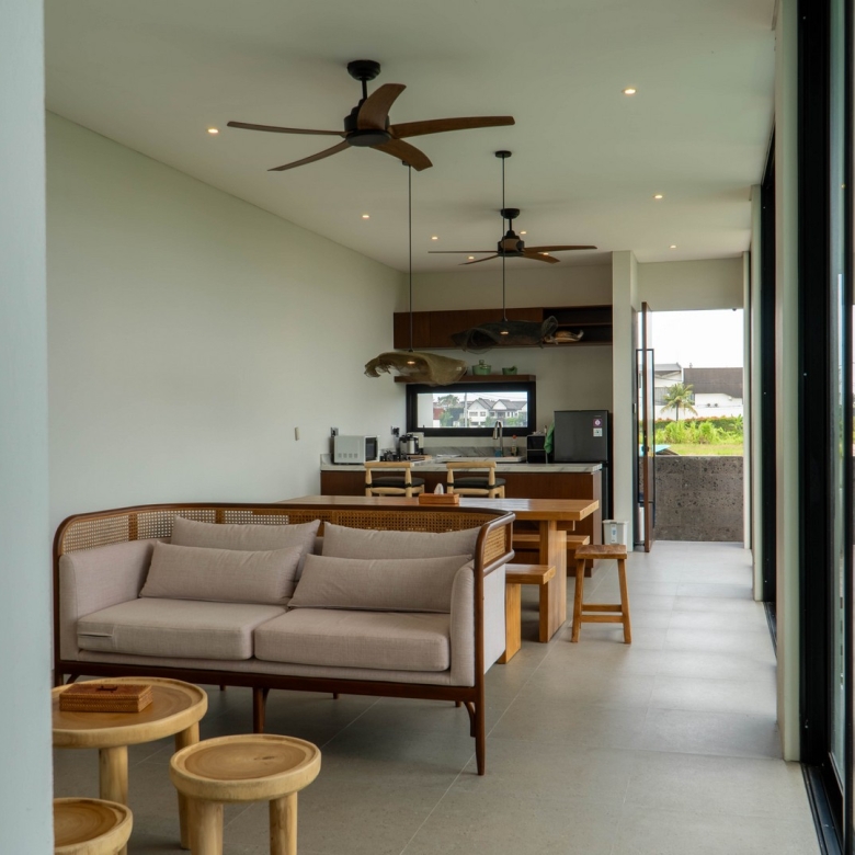 Completed in 2025, the villa is fully furnished and move-in ready, ideal for immediate occupancy or rental. Its clean, minimalist lines and natural materials evoke contemporary tropical living, with interiors flooded with light and views over the swimming pool and surrounding ricefields. Large sliding glass doors and expansive windows frame the west-south aspect, ensuring the home stays bright and welcoming throughout the day.