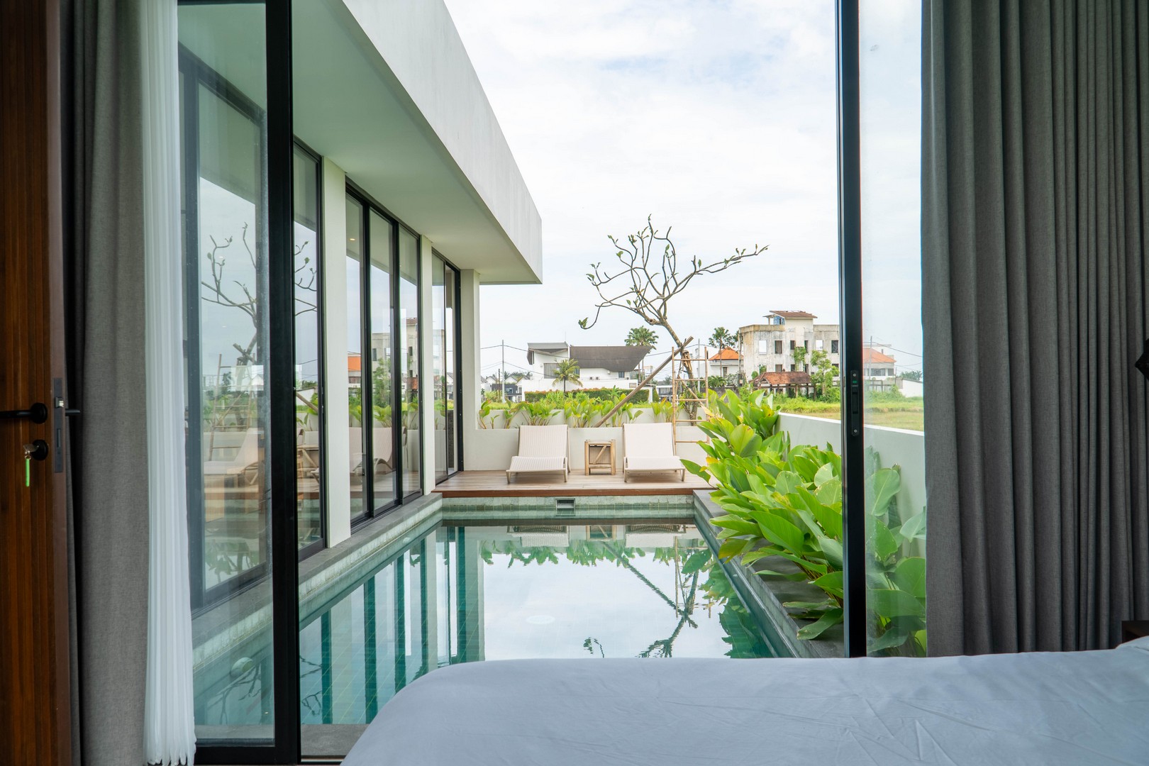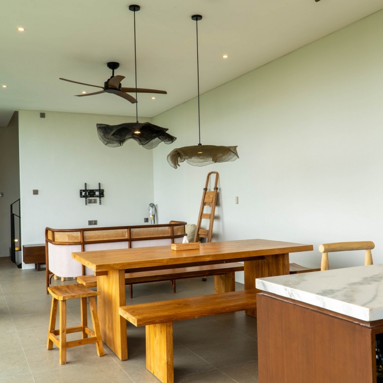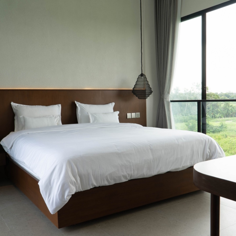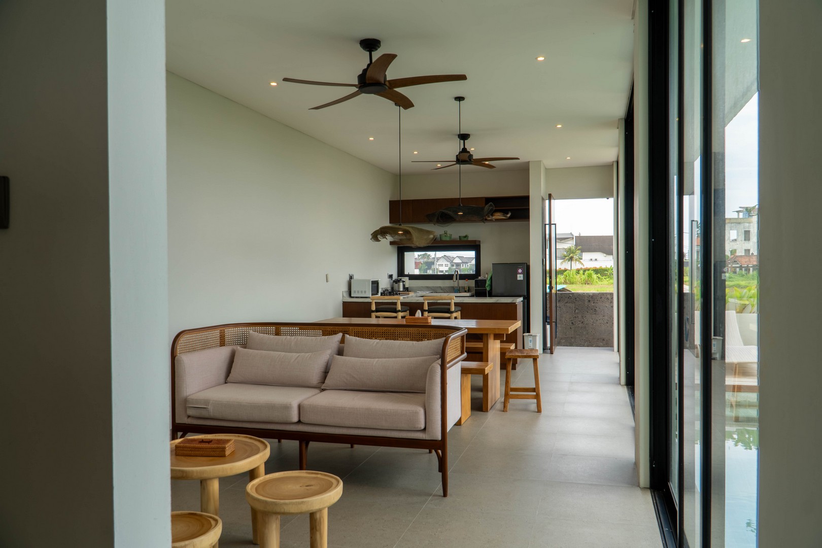 Completed in 2025, the villa is fully furnished and move-in ready, ideal for immediate occupancy or rental. Its clean, minimalist lines and natural materials evoke contemporary tropical living, with interiors flooded with light and views over the swimming pool and surrounding ricefields. Large sliding glass doors and expansive windows frame the west-south aspect, ensuring the home stays bright and welcoming throughout the day.