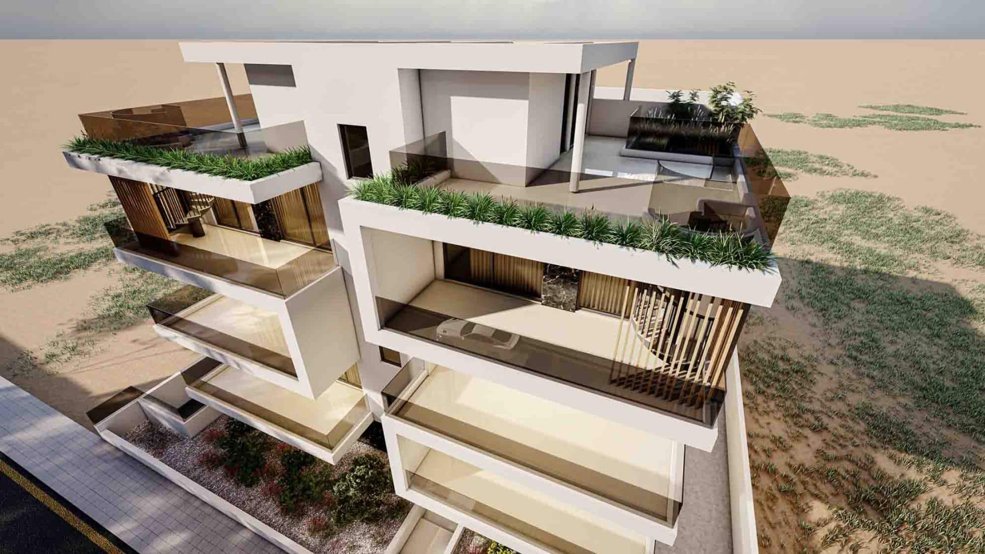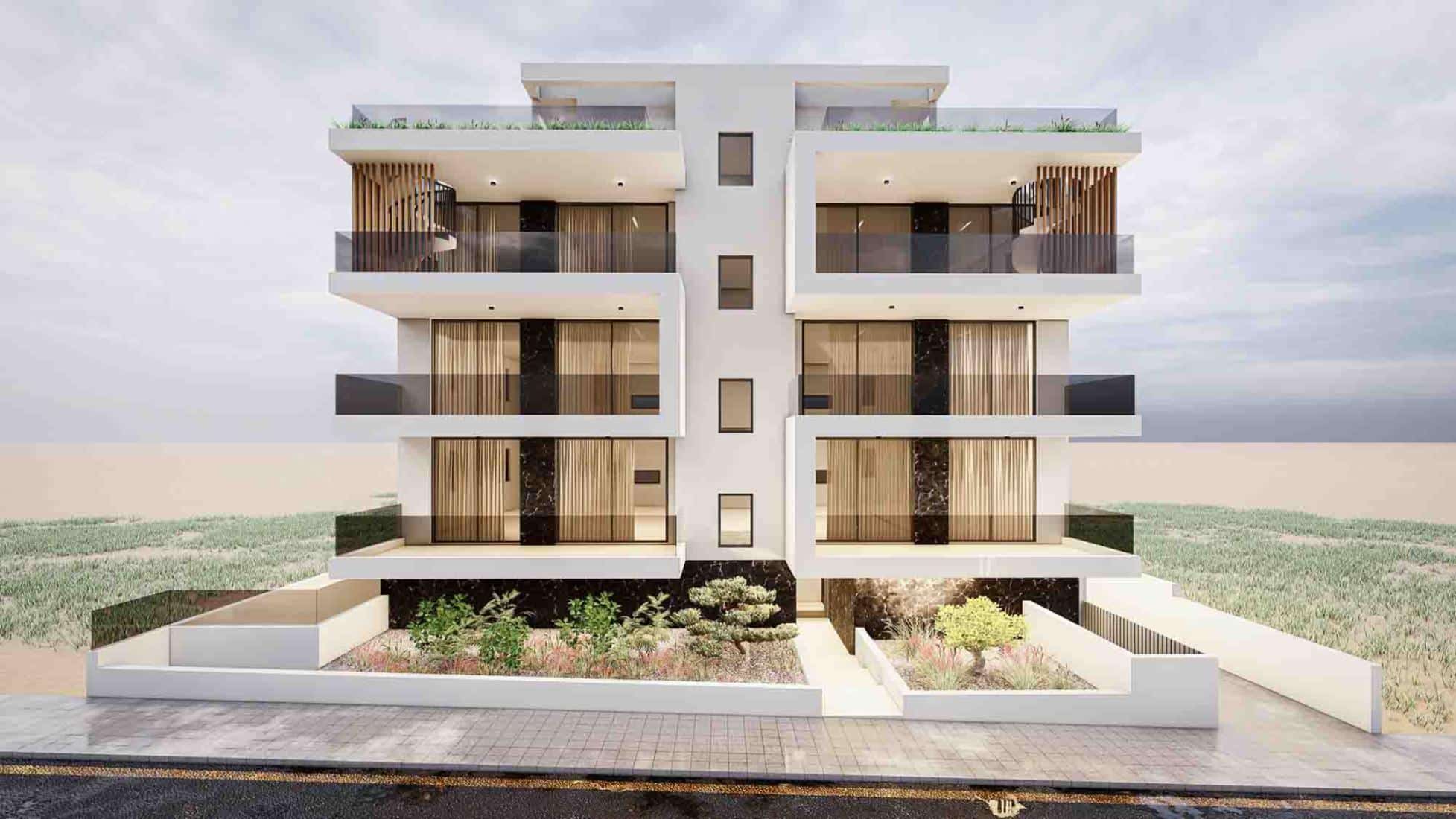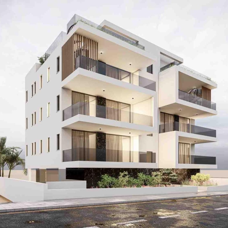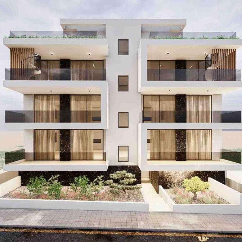 A modern residential cul-de-sac development, 1200m from the sea, with easy access to Larnaca center, and the highway for other cities. Only two apartments on each of the three floors, with open plan kitchen, 2 Master bedrooms with en-suite. Third-floor units enjoying private and individual access to a large roof garden on the 4th floor with its BBQ area as well as an extra wc-shower and room that can be converted into 3rd bedroom. Furthermore, these top floor units will have net metering and a photovoltaic system.