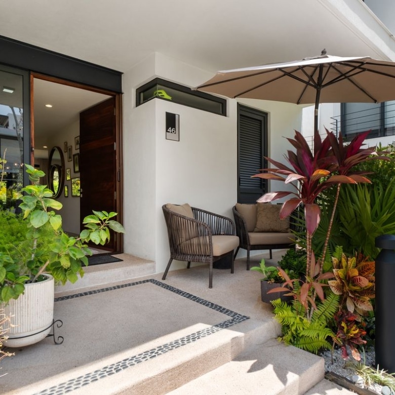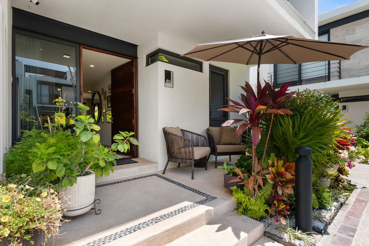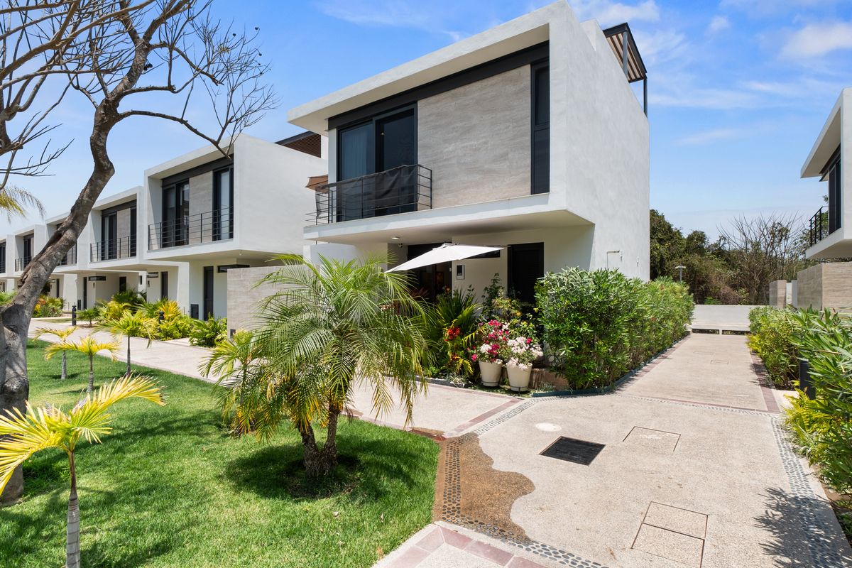 Vista Natura 46 is a beautifully furnished, 3-bedroom, 4-bathroom turnkey corner home located in a newly developed gated community in Nuevo Vallarta—just steps from the beach. Spread across three levels, it features a bright, open layout with a ground-floor flex room and full bath, a well-appointed kitchen, and spacious living/dining areas that open onto a private garden terrace. Upstairs, all three bedrooms include en-suite baths, complemented by a cozy TV lounge, while the expansive rooftop terrace offers a covered space with hookups for a hot tub and grill—perfect for enjoying the coastal breeze. The home is equipped with solar panels and EV charger-ready wiring for low-cost, energy-efficient living, and includes two deeded parking spots. As part of a 2-hectare community of just 56 homes, residents enjoy access to resort-style amenities such as a pool, jacuzzi, gym, yoga terrace, game room, BBQ areas, and 24/7 security.