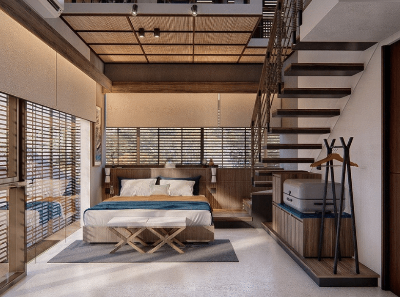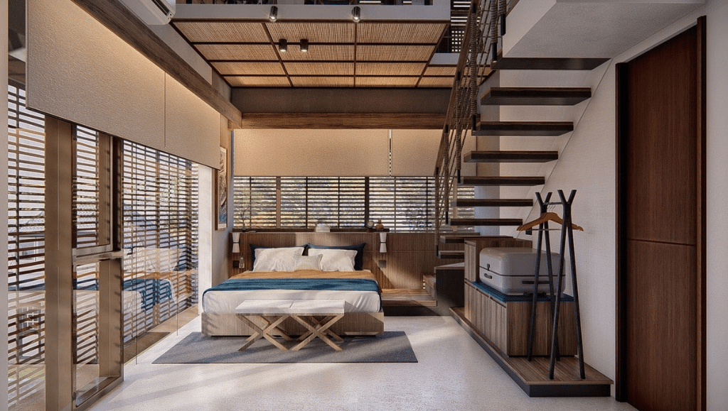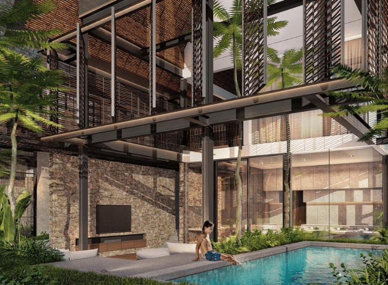 Spanning a land size of 165 sqm and a generous building size of 278 sqm across two floors, the villa is designed with a refined modern tropical aesthetic. The interior features three spacious bedrooms, each with a private bathroom equipped with rain showers and contemporary fixtures, plus a versatile mezzanine space that can function as a fourth bedroom, home office, or media room. The open-plan living and dining areas flow seamlessly to a western-standard kitchen, all framed by floor-to-ceiling windows that invite natural light into the space. Outside, a private swimming pool and on-site parking complete the picture of relaxed, stylish living.