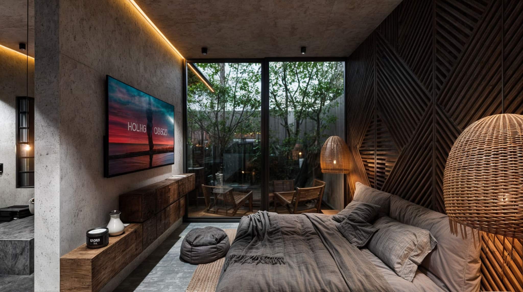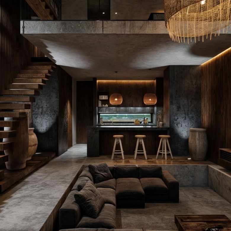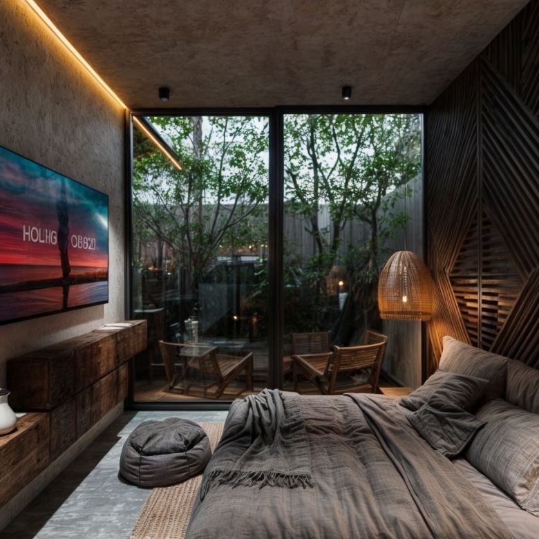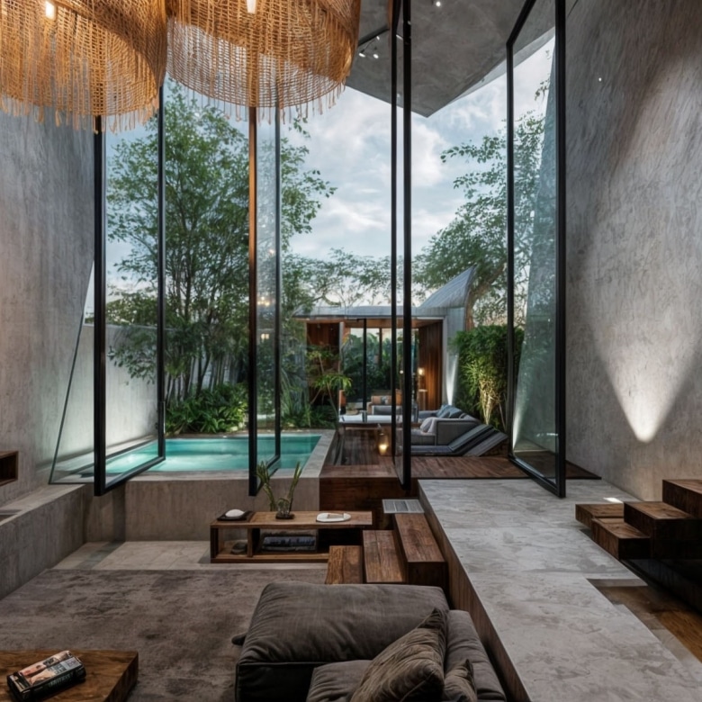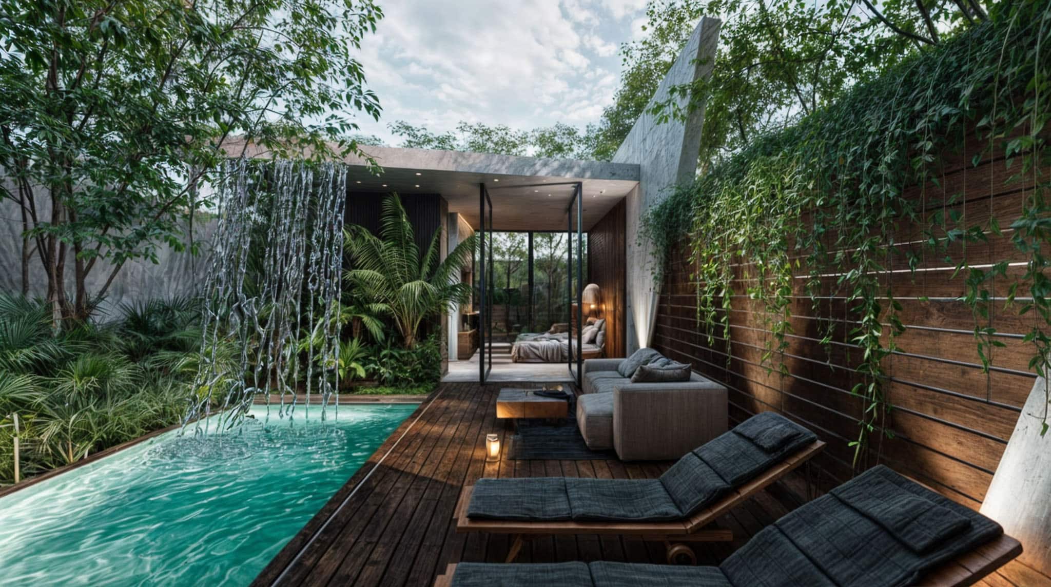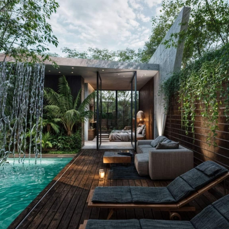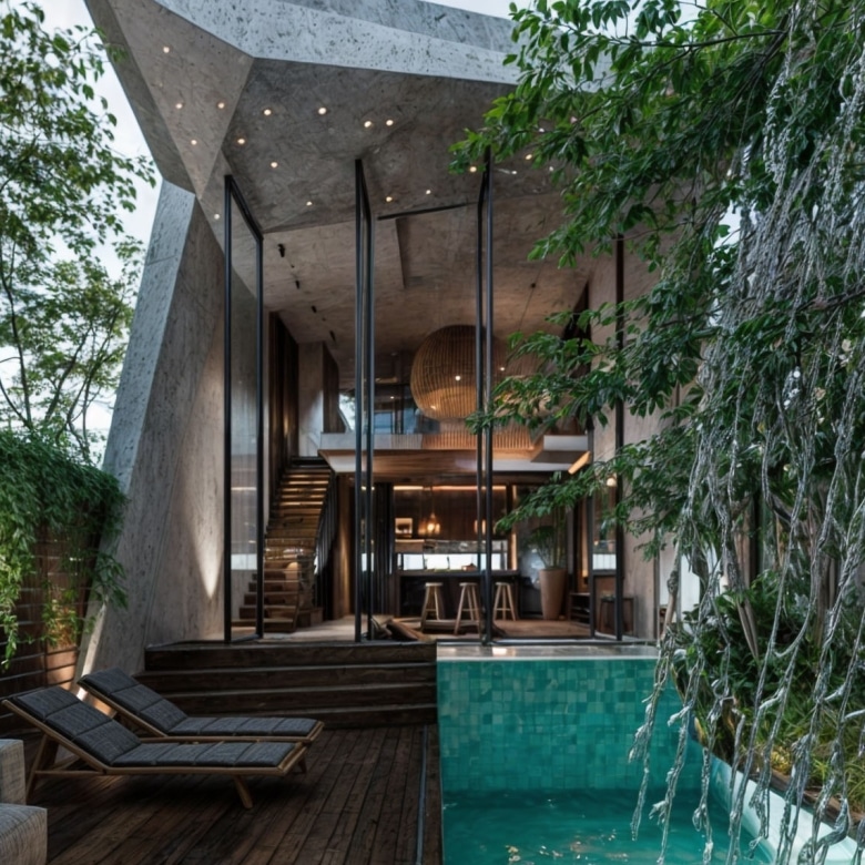 A highlight of this home is its private outdoor terrace, where a serene pool invites relaxation and leisure amidst lush greenery. The rooftop garden offers an additional oasis, complete with a pergola-covered lounge, a sun deck, and breathtaking views of the ancient trees and starlit skies, providing an ideal space for entertaining or quiet reflection.