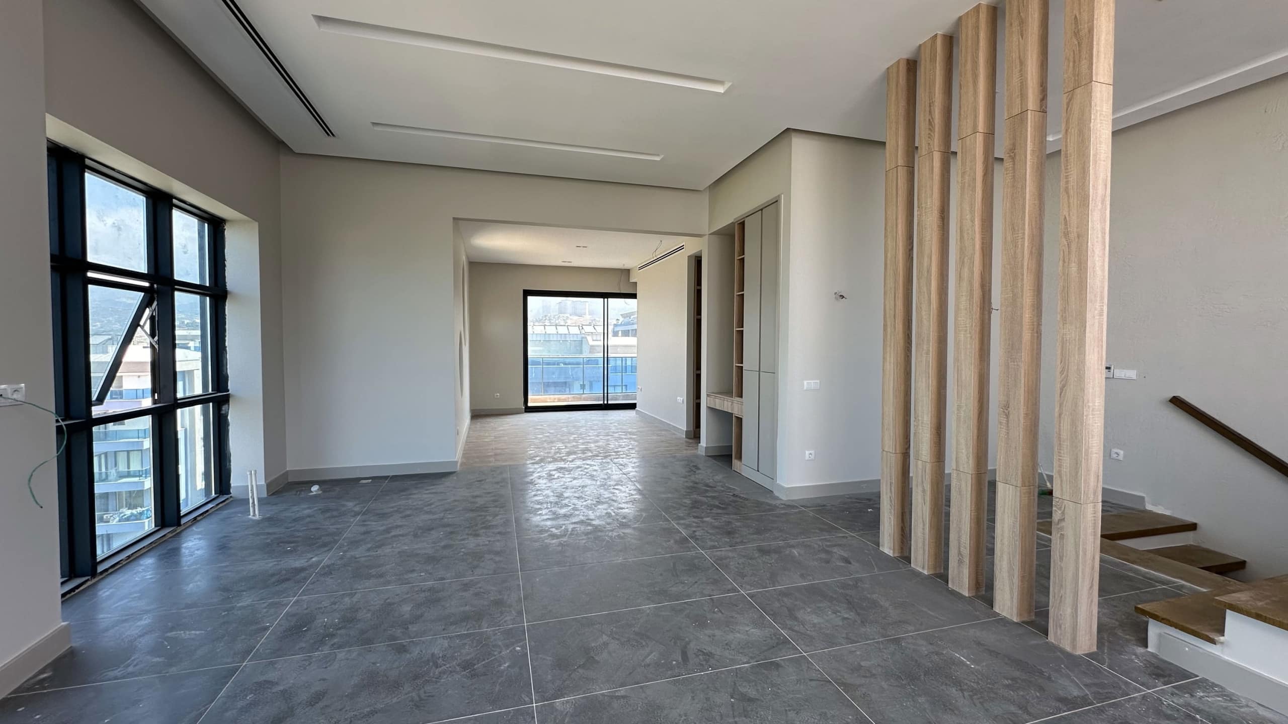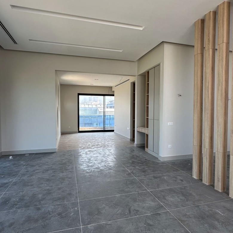 With 120 m² of interior space, the apartment blends a clean modern aesthetic with subtle Mediterranean warmth. The open-plan living area flows across light-toned ceramic floors, creating a sense of unity between spaces. Soft beige walls filter the natural light, making the rooms feel bright yet relaxing, while allowing the furniture to stand out.