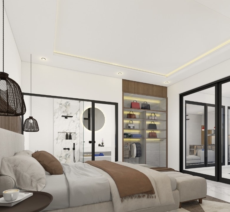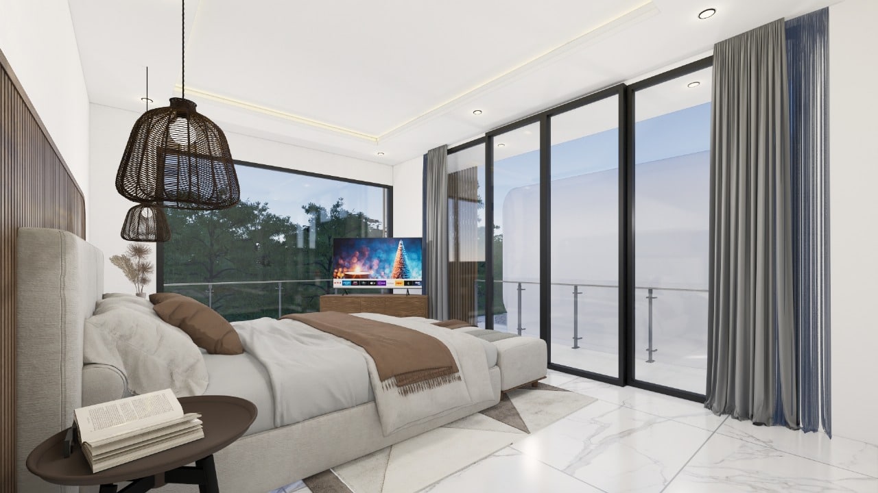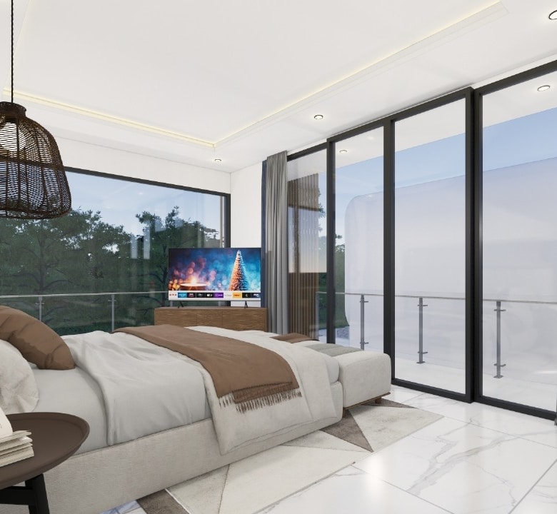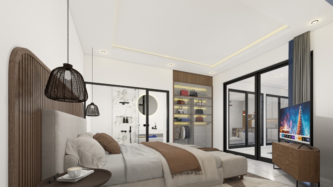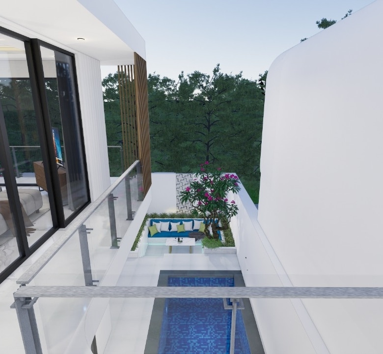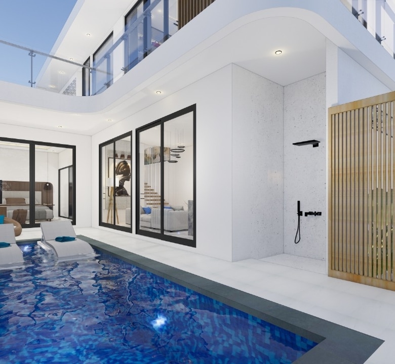 Sitting on 167 sqm of land with a generous 208.2 sqm of built space, the villa offers two stylish bedrooms, one on the ground floor opening directly to the pool, and one upstairs with its own lounge balcony and pool views. The enclosed living and dining area is paired with a sleek western kitchen, while floor-to-ceiling glass brings in natural light throughout. The villa features two bathrooms, a private pool, ground-floor poolside lounge, and parking for one car.