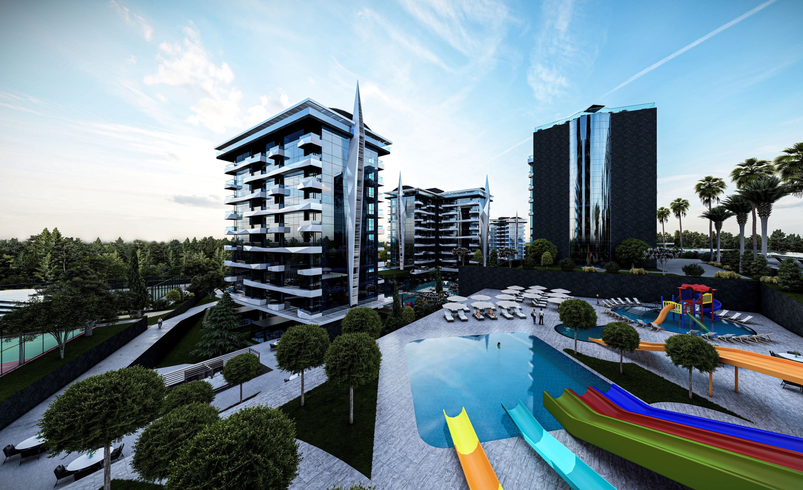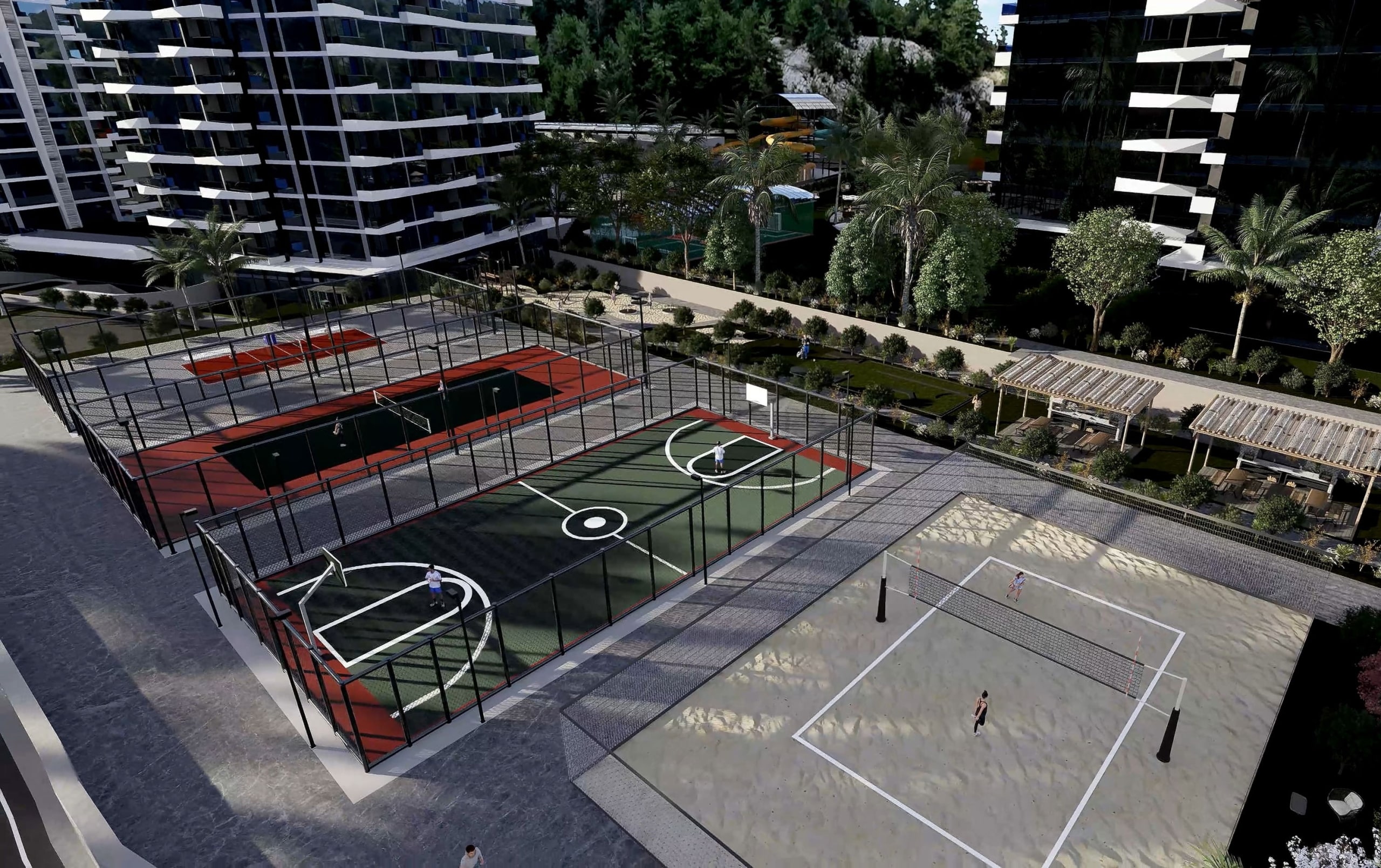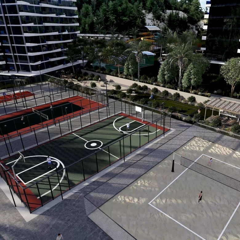 – Recreational facilities including a tennis court, basketball court, and mini golf