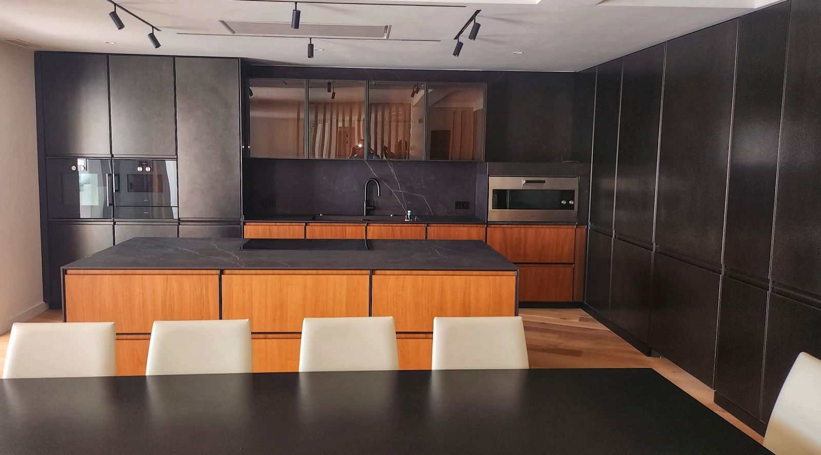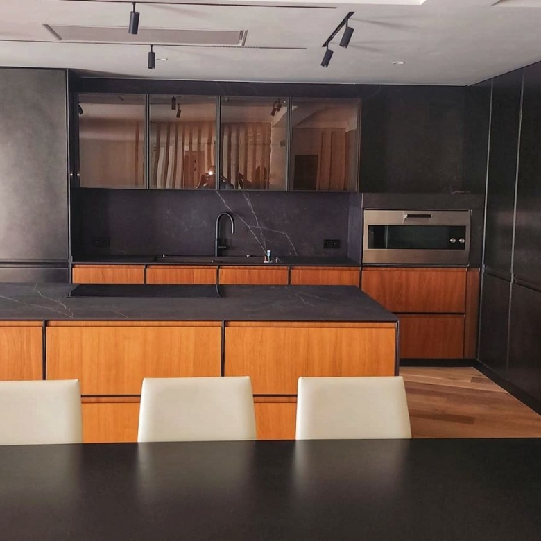 The flat offers a unique private relaxation area, designed with comfort and leisure in mind. The main terrace, located on the living room level, with a spacious chill out area, outdoor barbecue and a comfortable dining table. On the upper level is a solarium with a private infinity pool – the perfect place for morning coffee or sunset dinner.