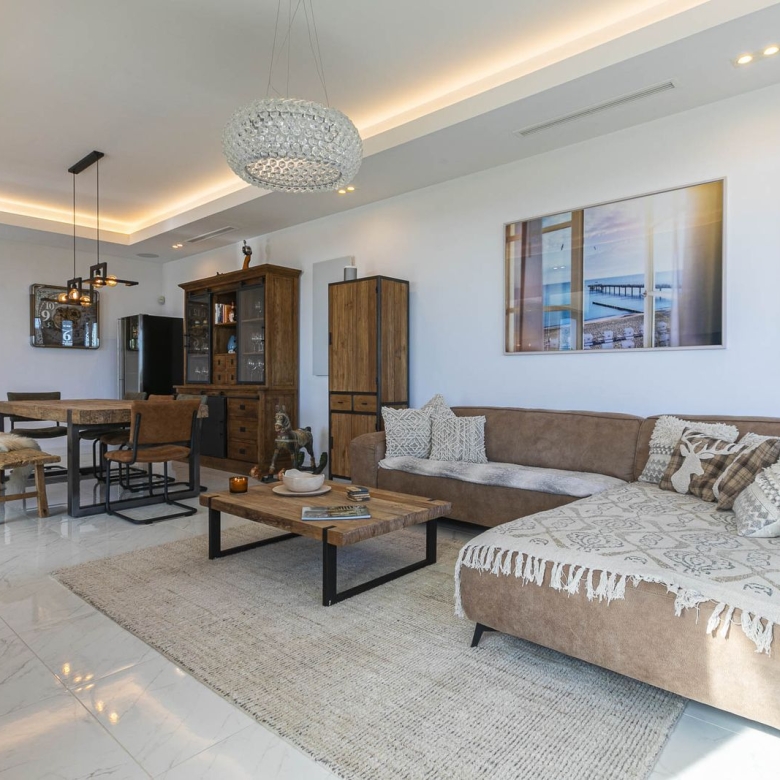 The interior, which combines elegance and functionality, offers: a spacious, bright living room with a modern fireplace and direct access to the terrace, an open, fully equipped kitchen with exclusive Gaggenau appliances, a breakfast bar and a built-in wine fridge, a master bedroom with en-suite bathroom and sea views, two comfortable guest bedrooms with beautiful views each one with own en suite bathroom and additional guest toilet.