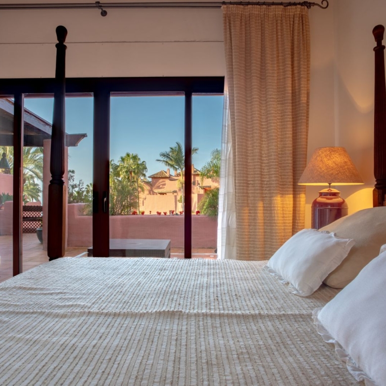 Impressive three bedroom south facing duplex penthouse in the prestigious and gated beachfront community Menara Beach, Estepona. This sought-after complex has well-kept tropical gardens, outdoor communal swimming pool, indoor heated swimming pool and gymnasium, as well as being just ten minutes’ drive to Puerto Banus and a short drive to shops, restaurants and all amenities. The property has an open plan living and dining area with patio doors leading to two private terraces with beautiful sea views; fully fitted kitchen with separate laundry area; guest suite with access to the terrace; guest bedroom; and a guest bathroom. The upper-level leads to the impressive master suite with vaulted ceilings and a private terrace; on this level there is an additional large terrace with BBQ area and stunning views of the community and sea. Other features include fitted wardrobes throughout, marble floors, hot and cold air conditioning, underfloor heating in the bathrooms, private parking and store room.