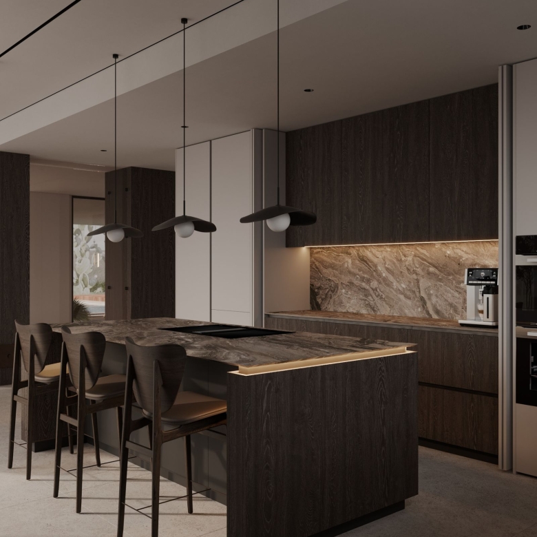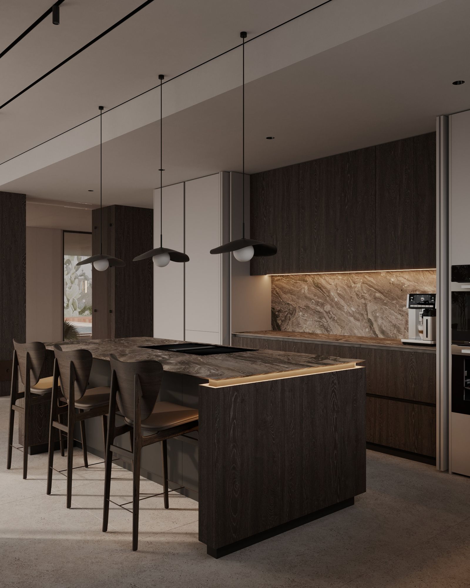 The penthouse features expansive interiors flooded with natural light and designed with elegance in mind. The main level showcases three spacious living rooms, two fully equipped modern kitchens with Miele appliances, two guest toilets, and two home offices—all flowing seamlessly onto large terraces with uninterrupted sea views.