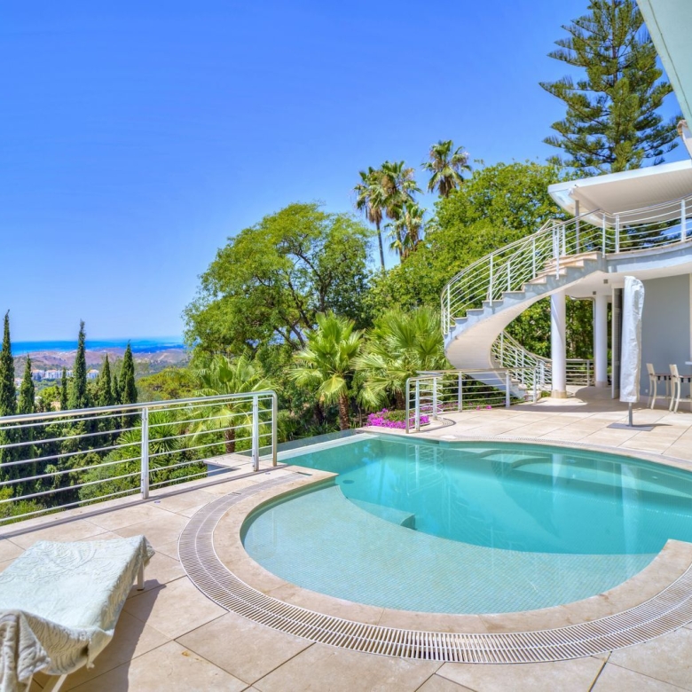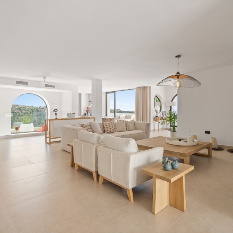 Very exclusive duplex penthouse, South facing, consisting in 3 bedrooms, 2 bathrooms, fully fitted kitchen and large lounge and dining area with access to a very nice terrace overlooking the fantastic gardens and pool area of the complex. On the upper floor we find an enormous master bedroom with en suit bathroom, large walking wardrobe and office. We also find another very large terrace with bar. garage and storeroom are included.