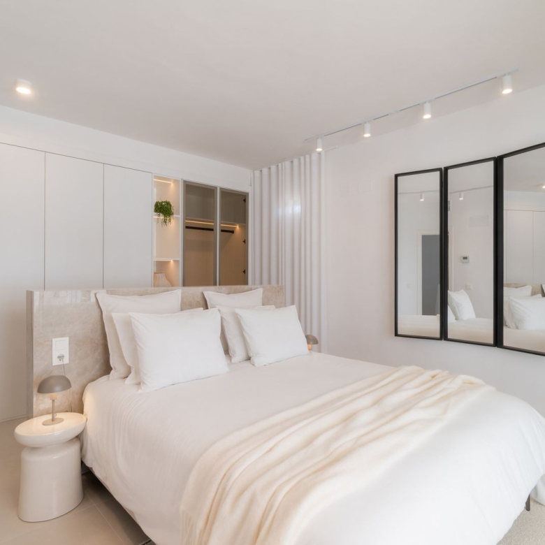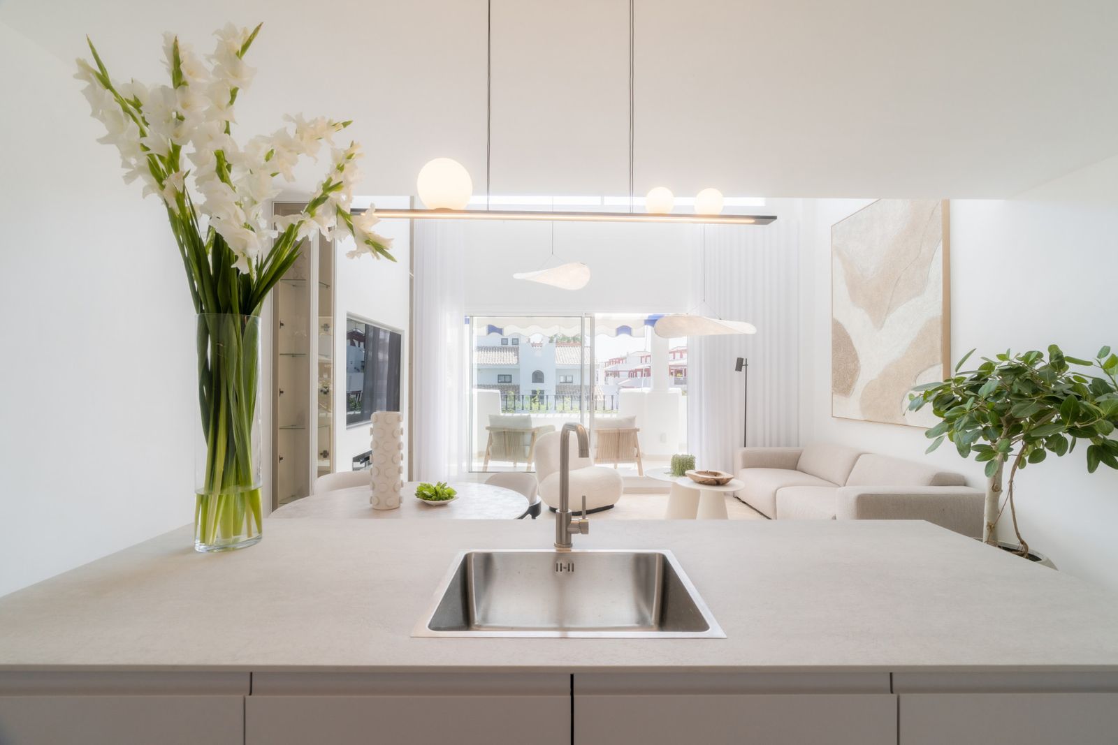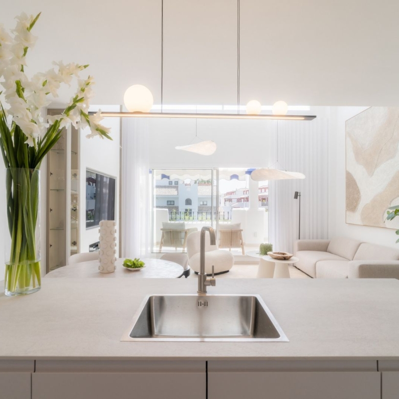 Furnished in elegant Scandinavian style, the home features a bright open-plan kitchen, and a spacious living area with a charming vaulted ceiling. Glass doors that open out to a private terrace with an outdoor dining table—perfect for enjoying the Mediterranean lifestyle.