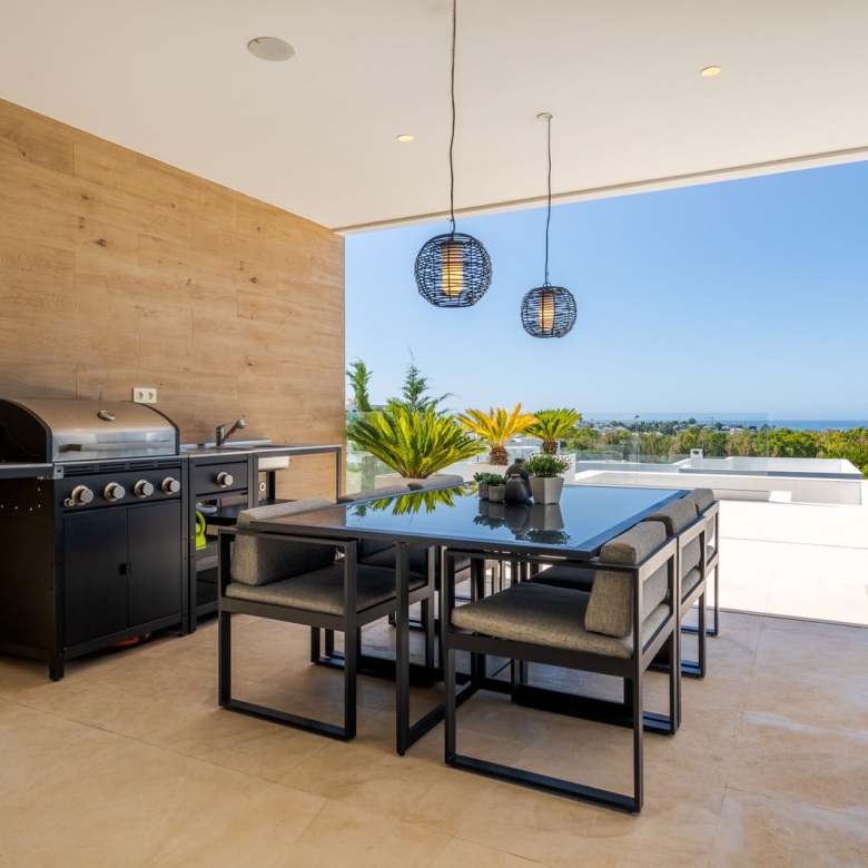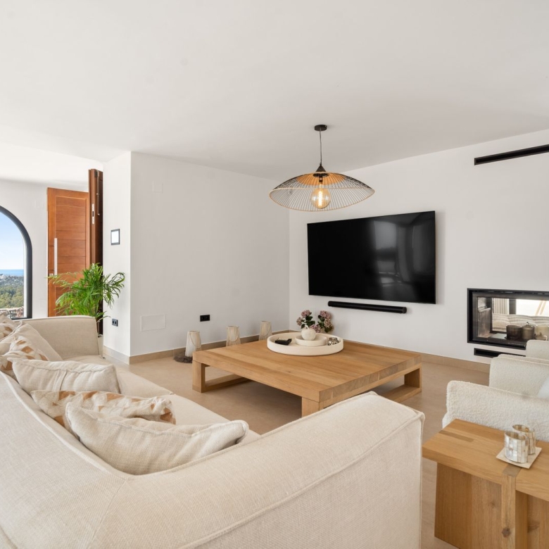 The staircase at the entry level takes you to the third bedroom with bathroom and an exterior door leading to the wrap around terrace and entertainment space with pergola and spectacular views. The property has also been micro cemented throughout. The apartment comes all furnished, including two parking spaces and 2 storage rooms in an underground communal garage.