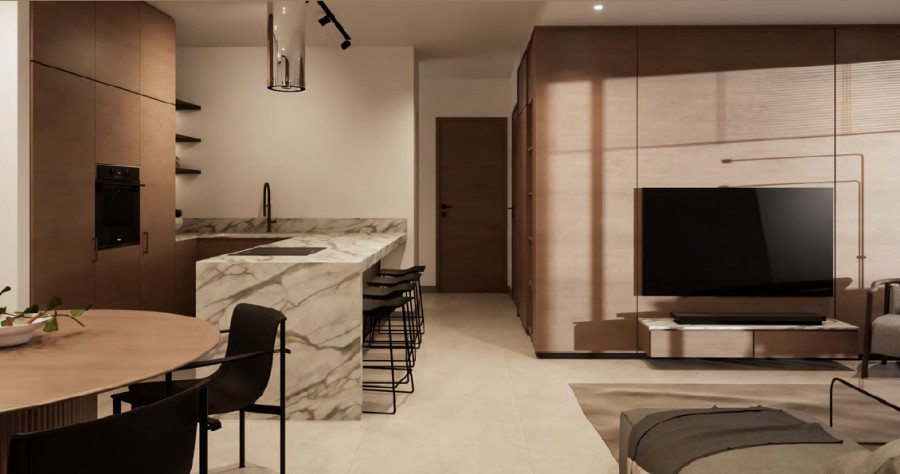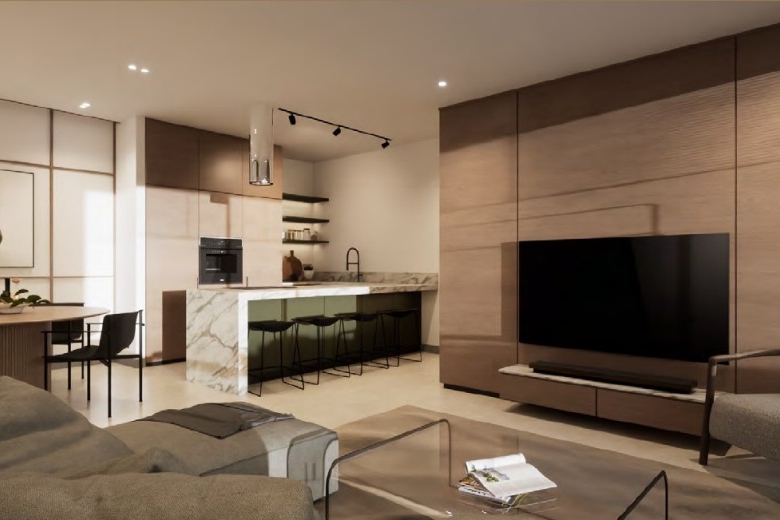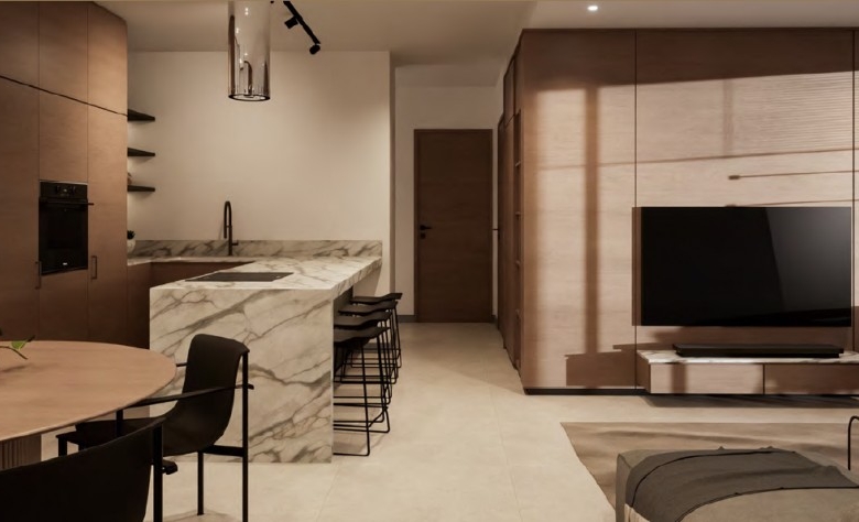 This luxurious 2-bedroom penthouse offers a spacious, open-plan design with high-quality finishes throughout. The apartment features thermal and moisture insulation for energy efficiency and comfort, with customizable flooring and premium woodwork. Double-glazed windows enhance insulation, while the kitchen is equipped with high-quality fittings and marble countertops. The penthouse includes a solar heater system, provisions for air-conditioning, electric heating, and various appliances. The building also features modern electrical installations, structured cabling, and solar panels. Additional amenities include a remote-controlled gate, automatic lighting in common areas, and a video-intercom system for added security.