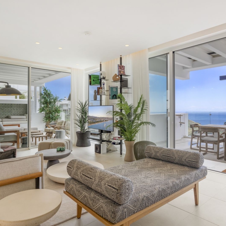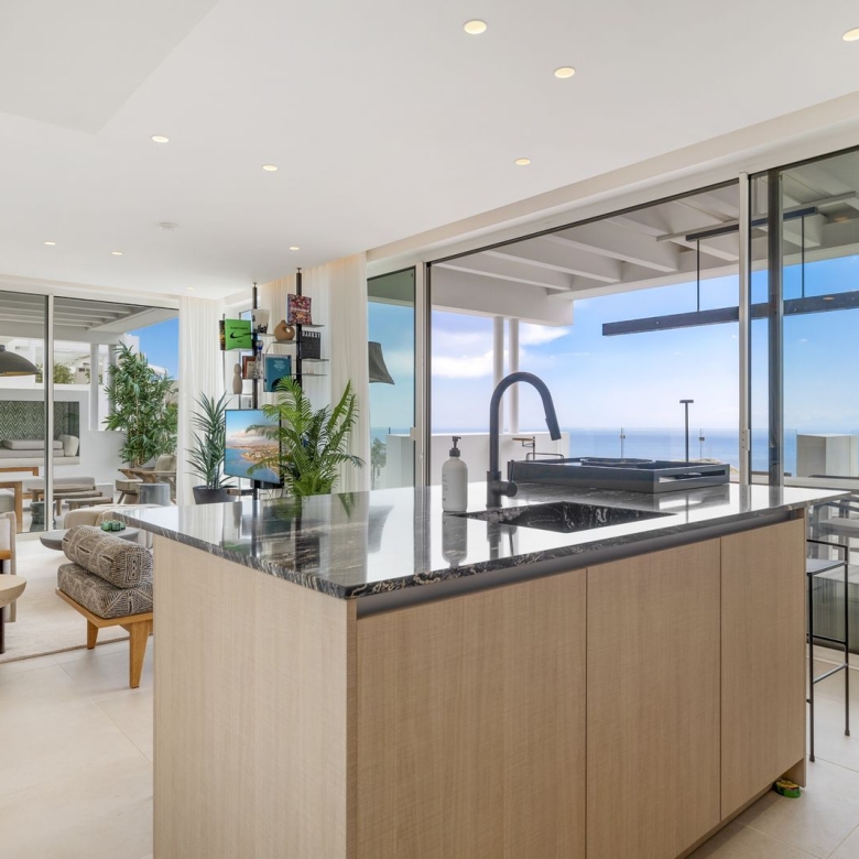 Bathed in natural light, this sophisticated home boasts a spacious sun-drenched terrace with a sought-after southwest orientation, offering uninterrupted views of both the Mediterranean Sea and the Sierra de las Nieves mountains. Floor-to-ceiling sliding glass doors connect the open-plan living area and the master bedroom directly to the terrace, creating a seamless indoor-outdoor flow.