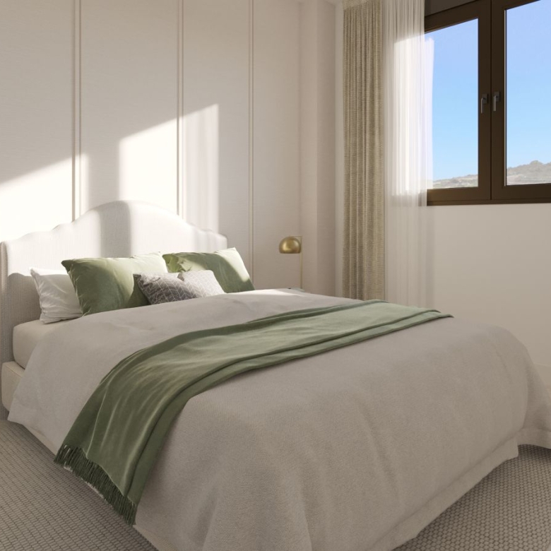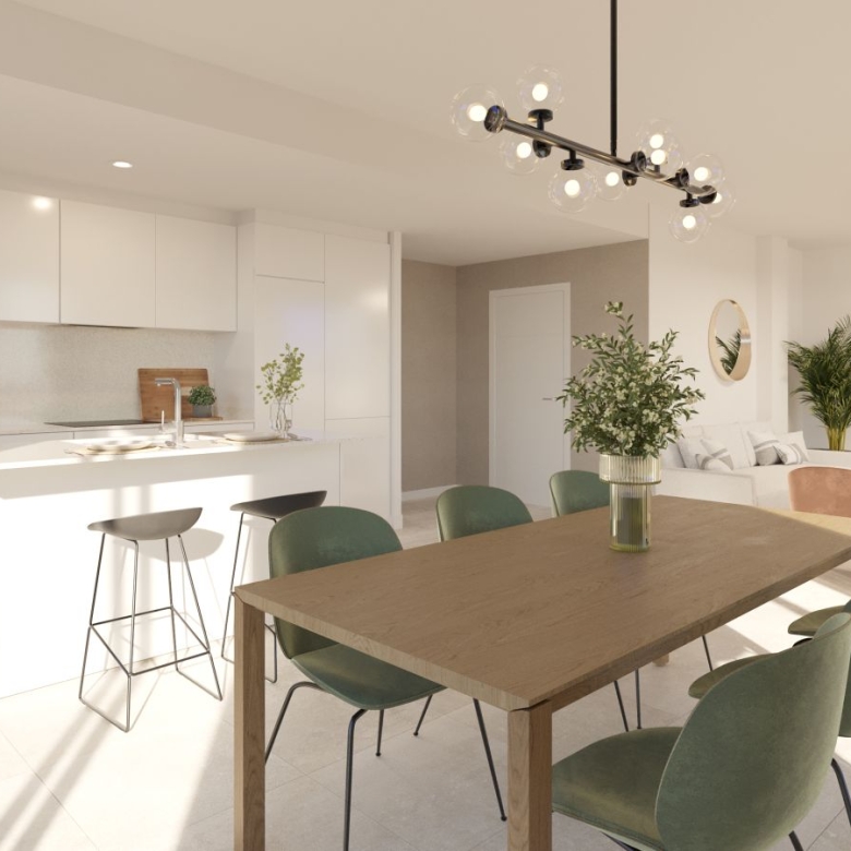 With lift access, the apartment is perfectly positioned next to a picturesque church in a peaceful yet vibrant setting. The interior features a bright, open-plan living and kitchen area, ideal for relaxed, modern living. The spacious double bedroom includes built-in wardrobes and an en-suite bathroom.