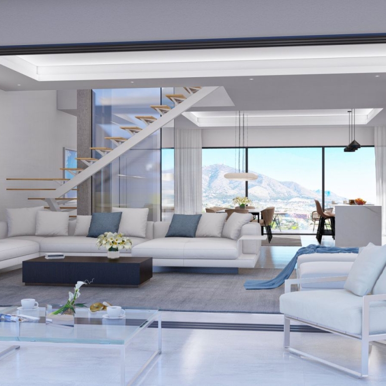 The living room is large and bright with direct access to the terrace with sea views. The terrace area is large enough to fit a dining table comfortably in one side and still have plenty of terrace area.