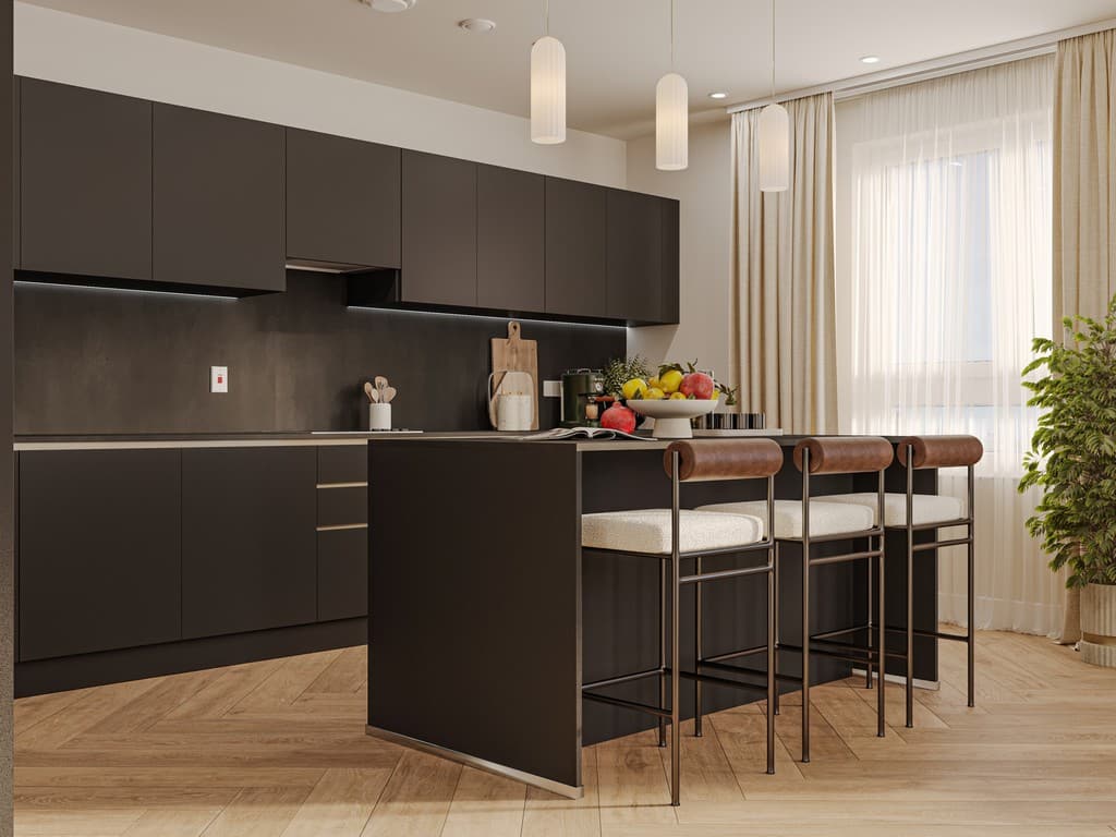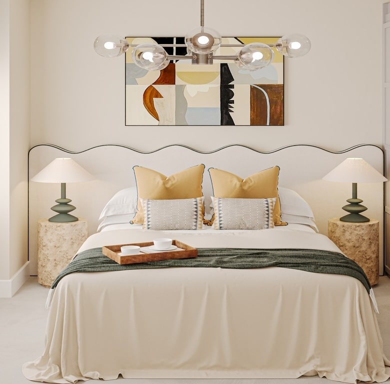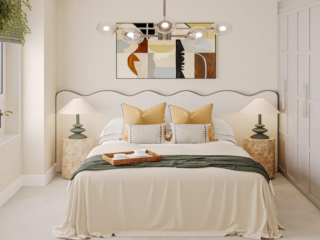 Smart design details such as herringbone flooring, USB-C charging points, fitted wardrobes, and pendant lighting