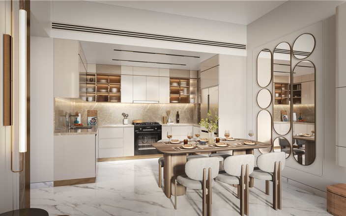 1-Bedroom Apartments – Spacious and elegantly designed with a well-defined living and dining area, fully equipped kitchen, private balcony, and a cozy master bedroom with built-in wardrobes.
