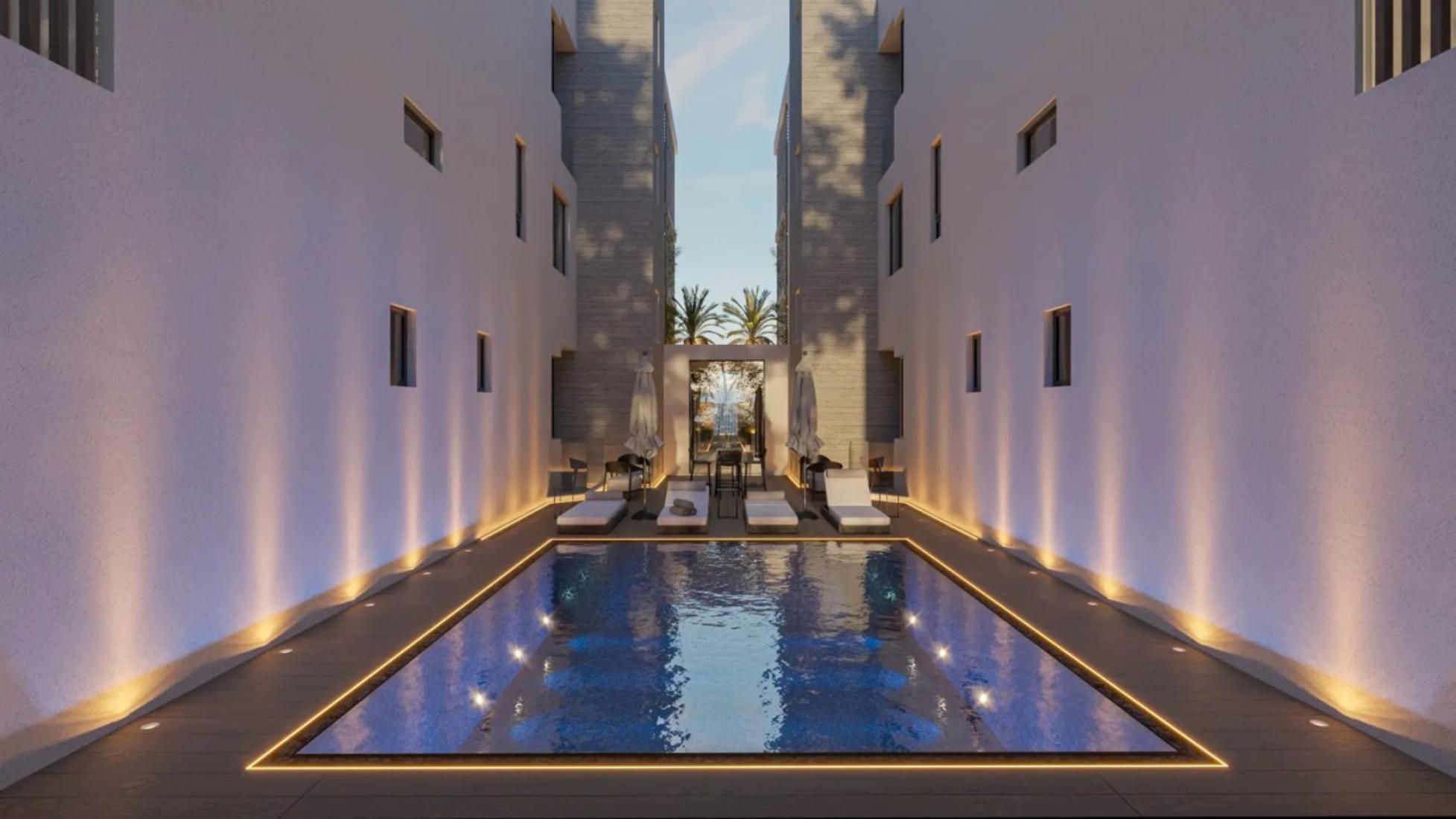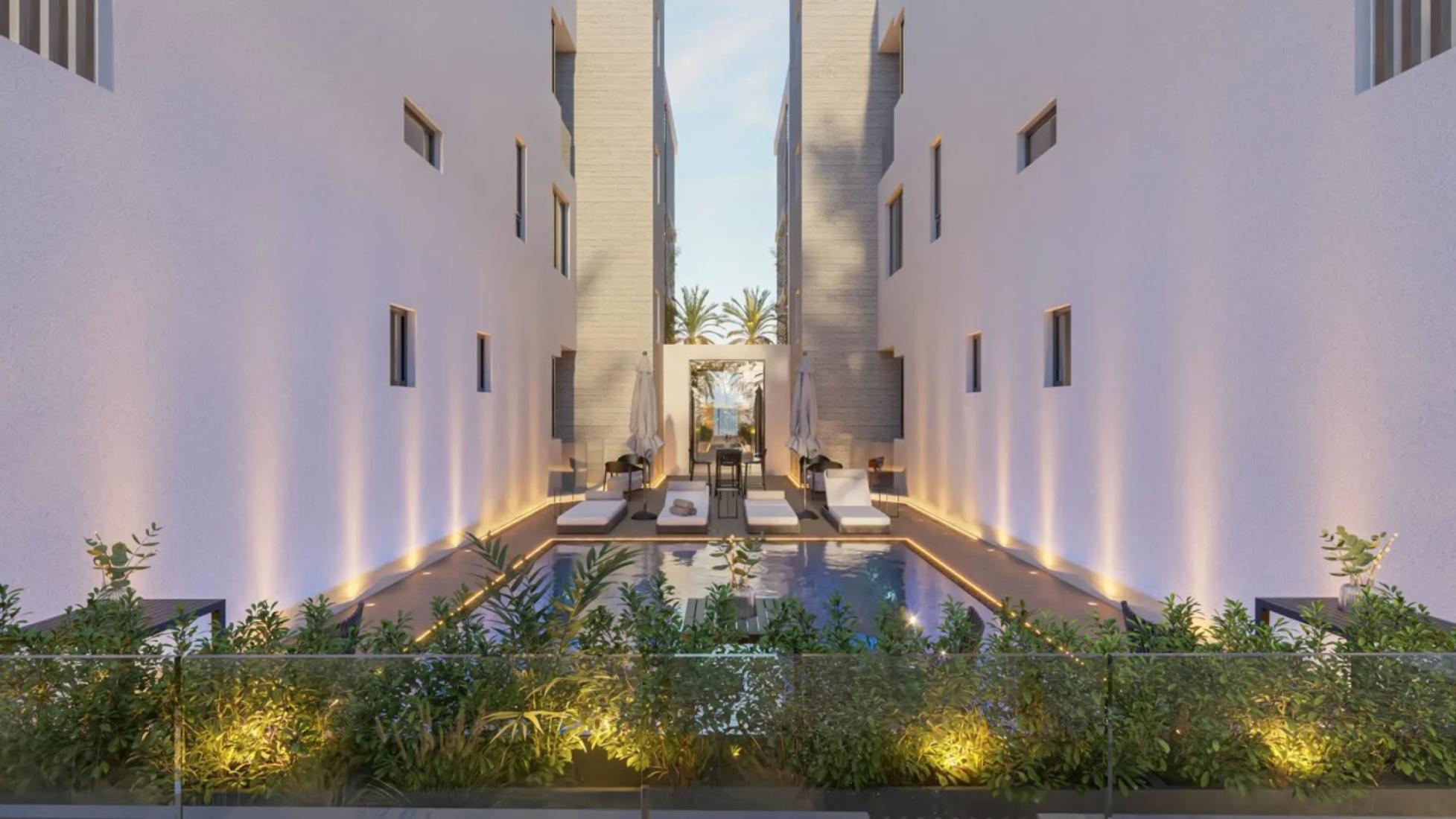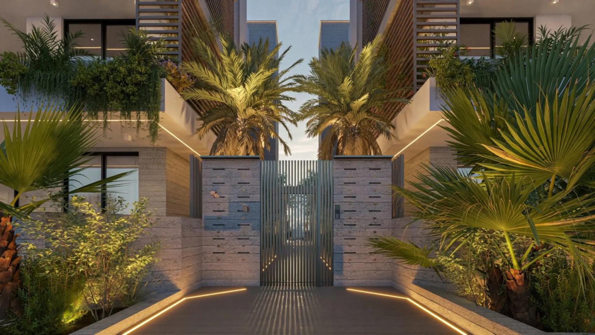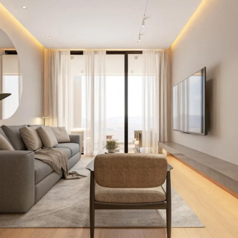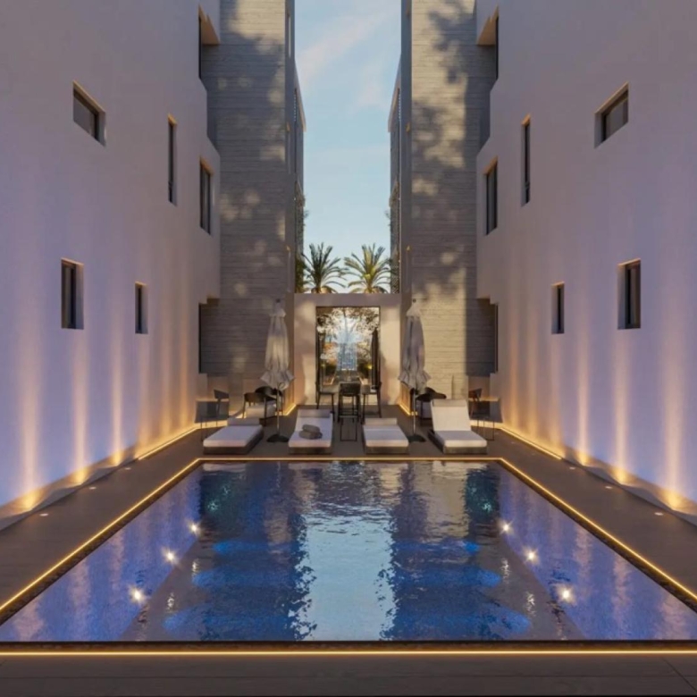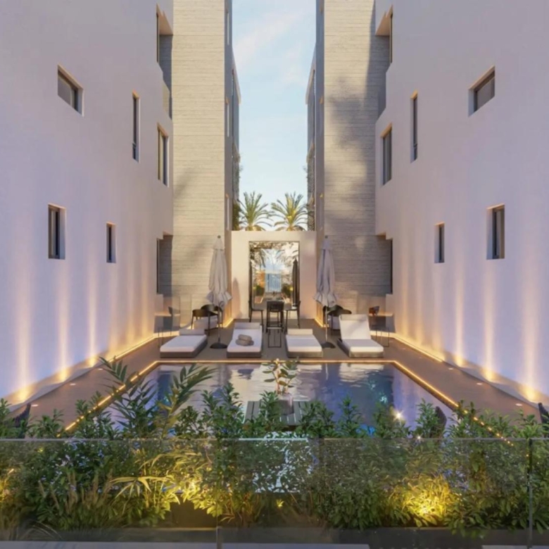 This is a luxurious Ground floor Flat in a modern gated resort comprised of two buildings, each with 14 elegantly designed apartments. Central to the development is a shared pool area surrounded by a private green space, offering a serene escape. Apartments feature spacious, open-plan layouts with 3 meter-high ceilings, 2.5 meter doors, and optional top-to-bottom 3-meter cabinets and kitchens. Each unit includes designated covered parking, a storage room, and modern conveniences such as CCTV, EV charging provisions, and photovoltaic panels for common areas. With its blend of elegance, functionality, and energy efficiency, this project redefines luxury living.