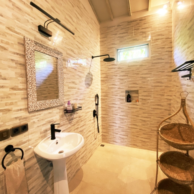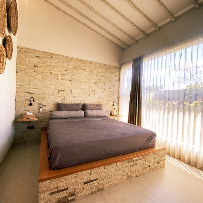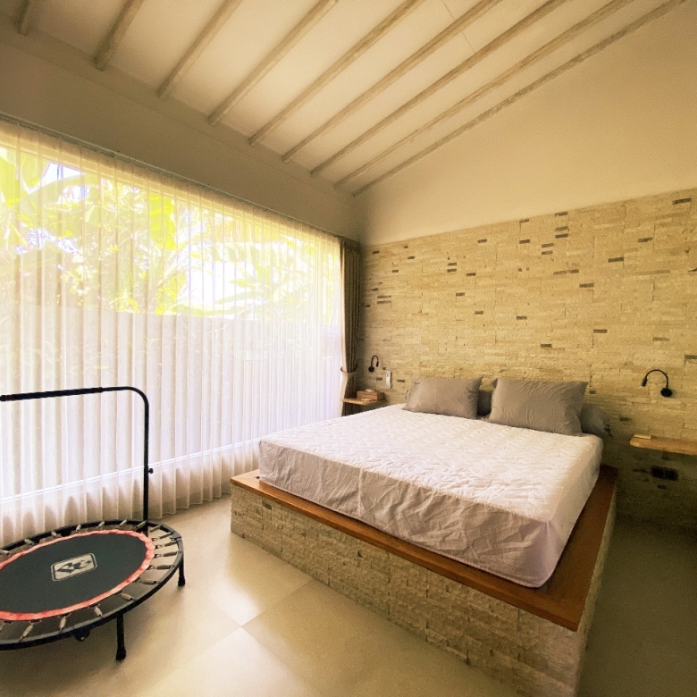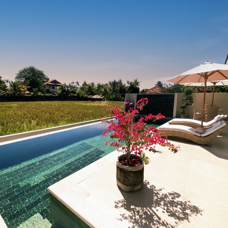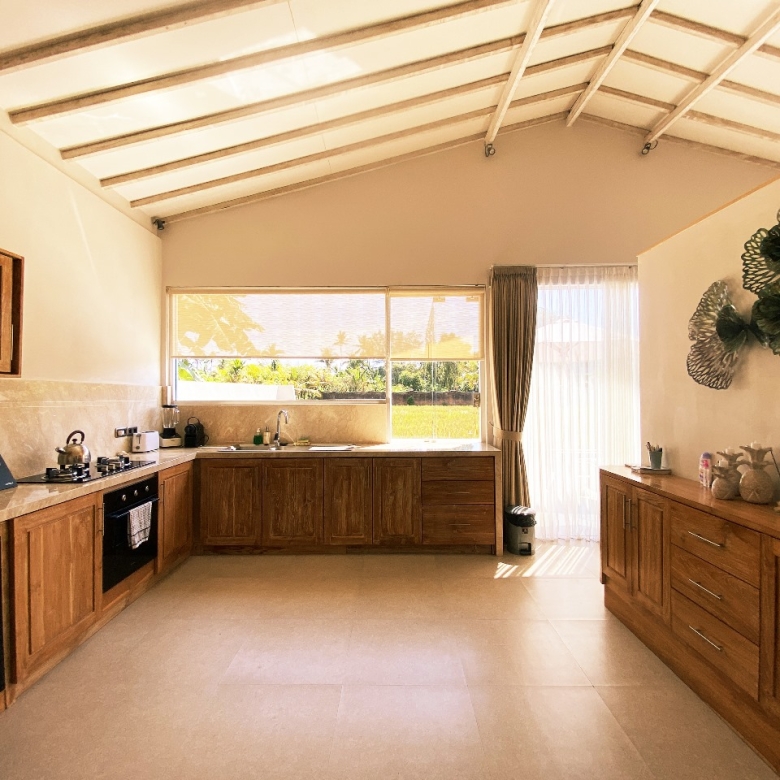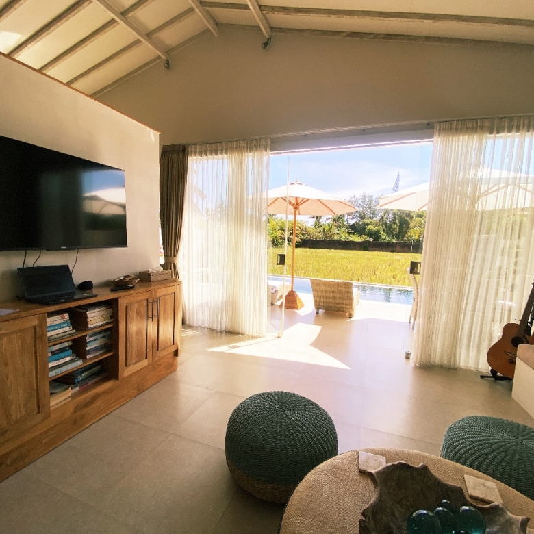 Set on 240 sqm of land with 113 sqm of single-storey living space, the villa is designed for comfort, simplicity, and elegance. The open-plan living area flows naturally into the dining space and Western-style kitchen, creating a bright and welcoming interior. Floor-to-ceiling glass doors open to the sun terrace and 3.5 x 8 metre pool, where you’ll enjoy unobstructed views of the ricefields and the distant sound of waves. Both bedrooms are generously sized and come with modern ensuite bathrooms featuring rain showers and quality fittings.