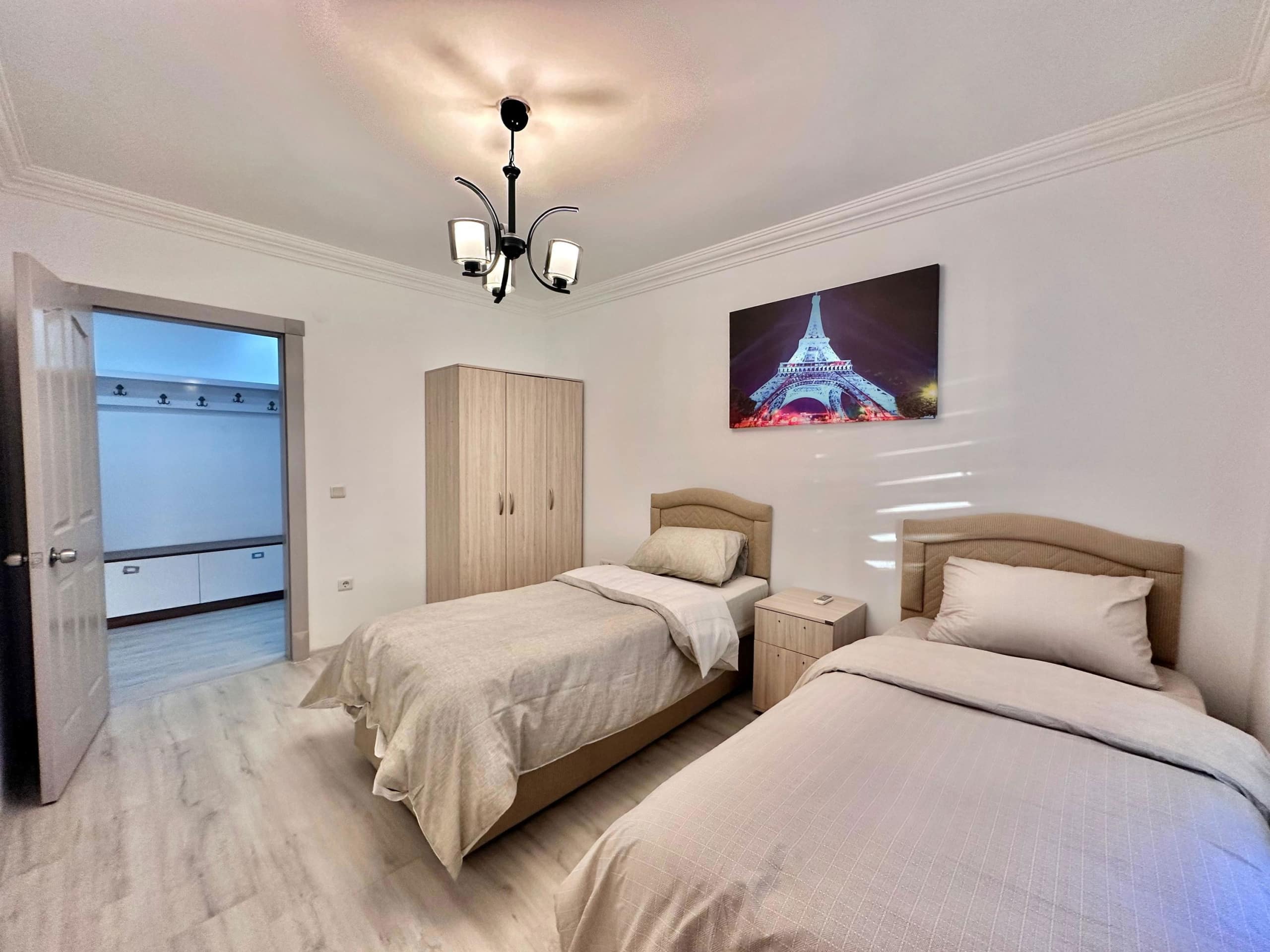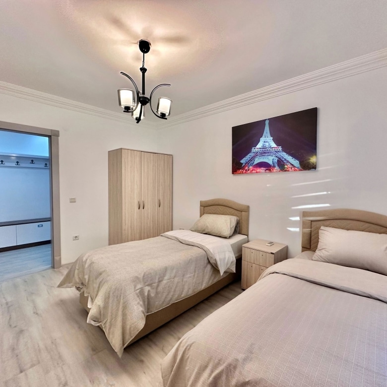 Second bedroom:Two single beds with soft beige linens and matching curtains—perfect for children or guests.