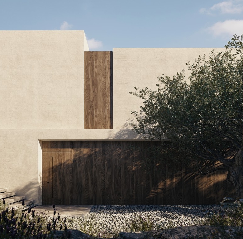 The soft, natural colours of the exterior are highlighted and softened by the use of terracotta screens and natural wood paneling, which flow effortlessly into the interior living spaces via a spacious outdoor living area. This outdoor space is ideal for relaxation and entertainment, complete with a built-in BBQ, a private swimming pool, and ample seating areas.