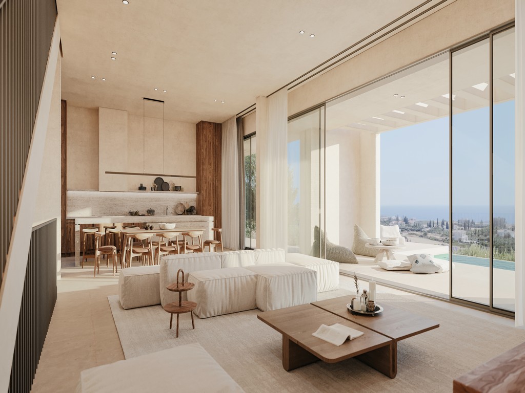 Sea Caves Paradise – The development was designed to complement and be complemented by the immediate surroundings. It is located at the top of a small canyon, with one of the properties accessed via a road leading down into the canyon to a lower-level plot. The area is predominantly scrub, grassland, and trees, interspersed with open patches of cream or white limestone. The development follows the natural landscape, with mature trees and a garden that blends seamlessly with the surrounding vegetation.