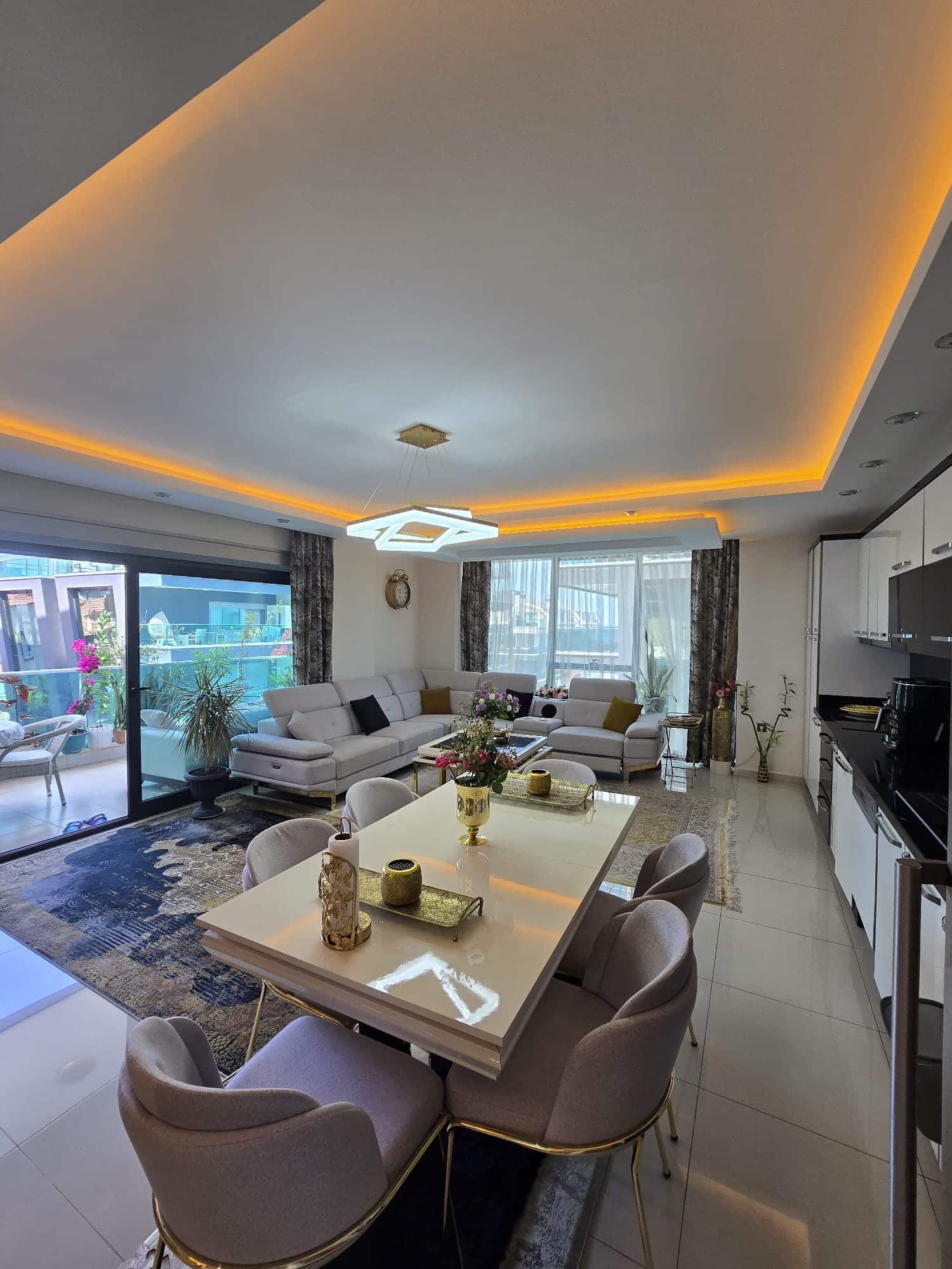 Living Room:A white corner sofa and a modern dining table add a contemporary feel. The ceiling features geometric forms with spotlights that bring character. Large sliding doors open onto a wide balcony where the sea and city view become the highlight. Perfect for summer evenings and social gatherings.