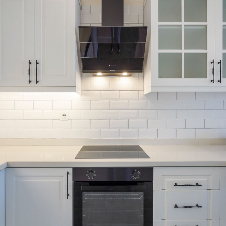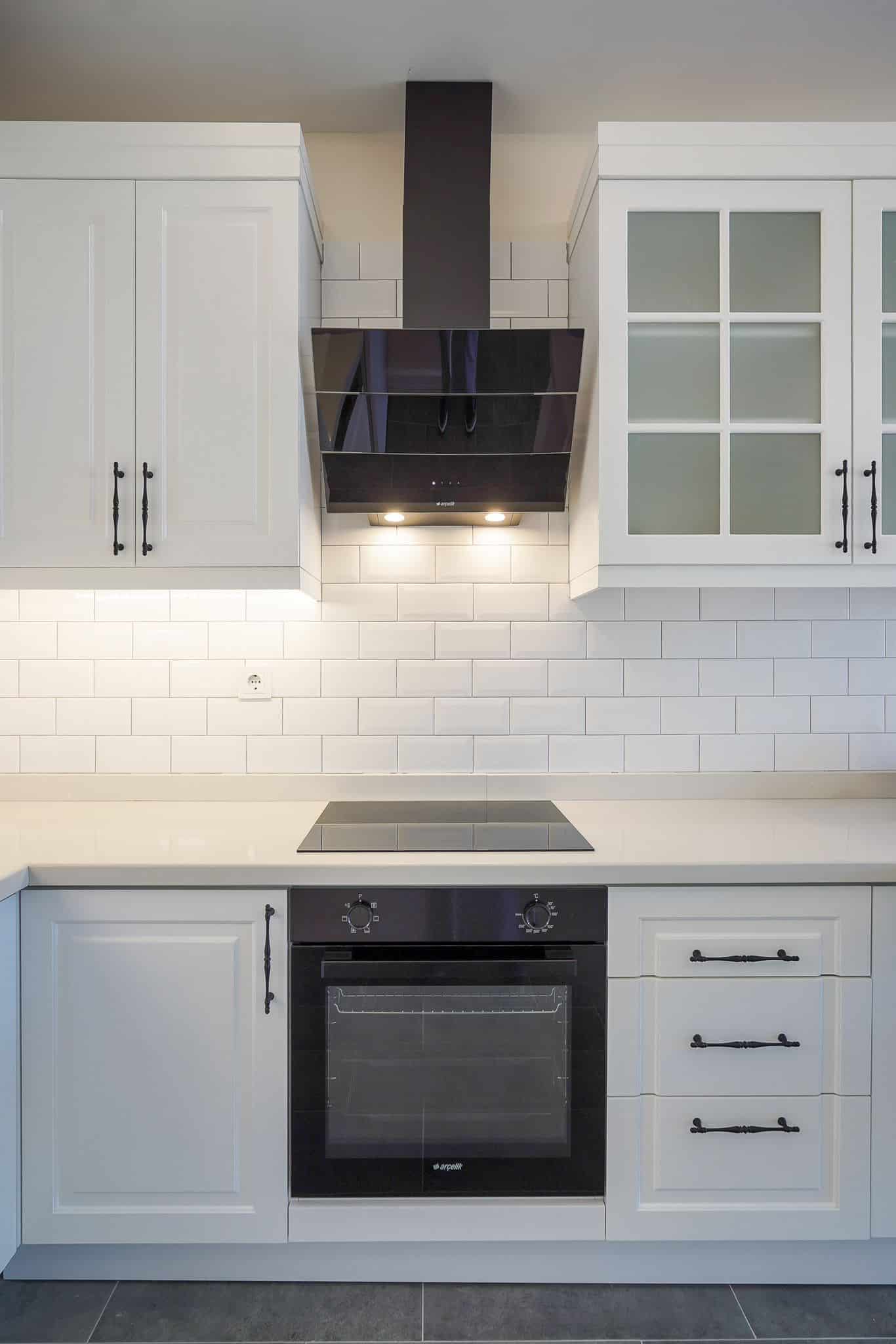 The American-style kitchen integrates seamlessly with the living room, offering white cabinetry, black countertops, and modern built-in appliances including a fridge, oven, and hood. Its layout supports social cooking and entertaining.