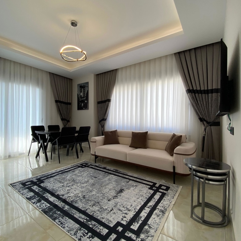 From the moment you enter, the space feels light and inviting. Large windows frame the view of Alanya’s city life, bringing a sense of connection to the neighborhood without the noise or chaos of busier streets. It’s the perfect setting for someone who values both convenience and calm.