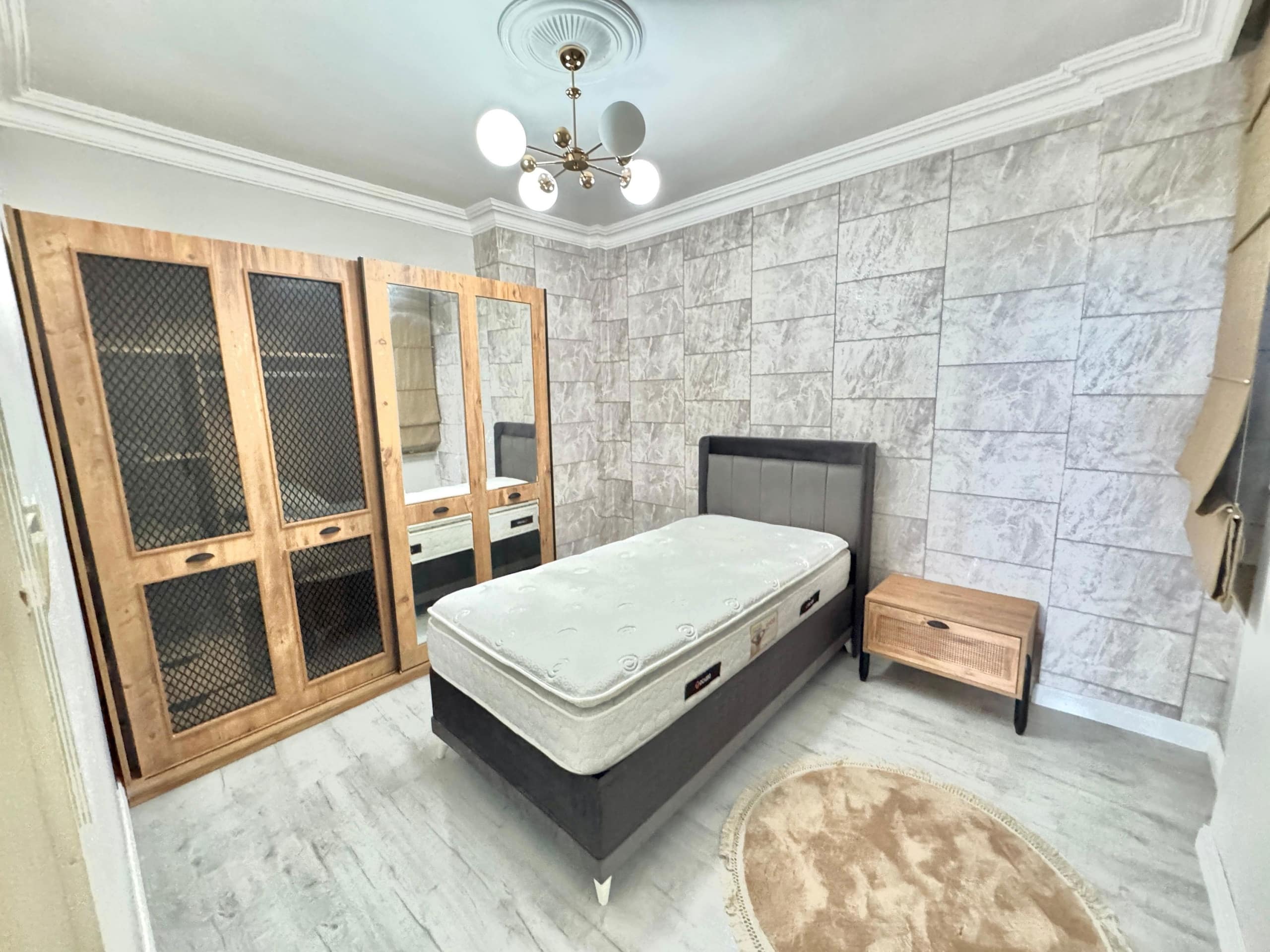 The bedrooms embracerustic touchesthrough natural wood textures and wardrobe doors with mesh-style panels, combining industrial and cozy vibes. Wall panels and soft-toned wallpaper add personality while maintaining a relaxing ambiance.