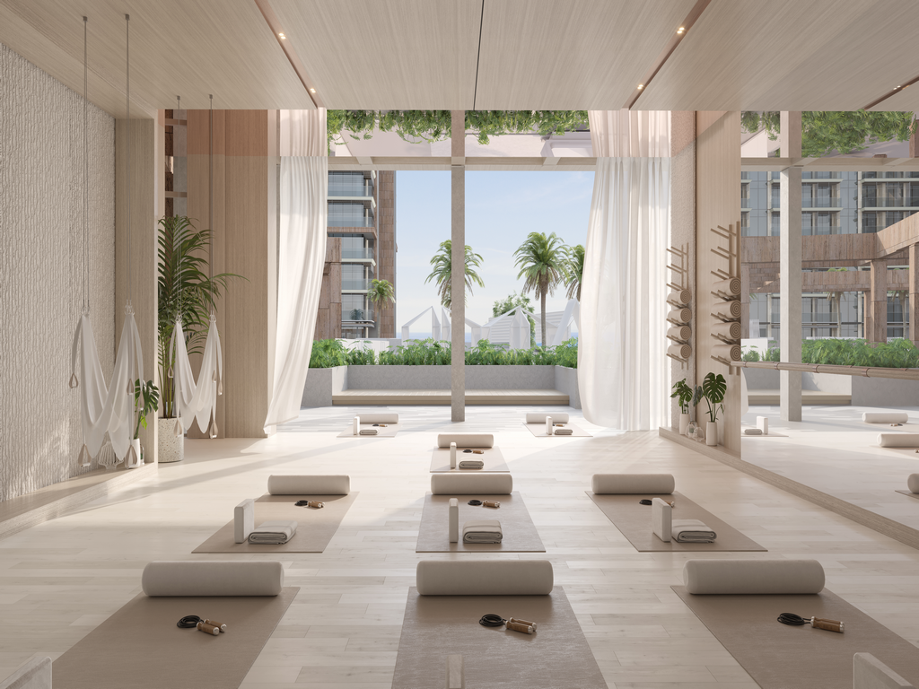 Comprehensive fitness studio, yoga areas, and outdoor fitness zone