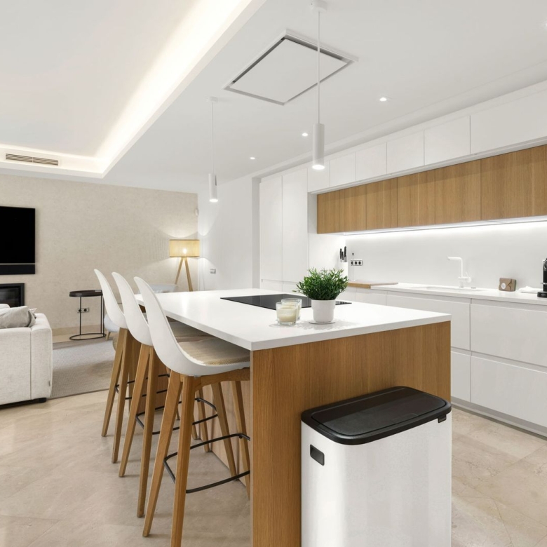 Spanning four meticulously crafted floors, all seamlessly connected by your private elevator, Villa Number 9 showcases unmatched architectural brilliance. The expansive living room, with its dramatic double-height ceiling, creates a grand and airy atmosphere perfect for entertaining. This space effortlessly blends into a beautifully designed terrace, maximizing the indoor/outdoor lifestyle. Additionally, the interior patio, featuring a majestic mature olive tree, fully opens to extend the already spacious living area, enhancing the fluidity and openness of the home. The sleek, state-of-the-art Gaggenau kitchen is a luxury in itself, equipped with a vacuum sealer, steam oven, conventional oven, plate warmer, and wine fridge—a testament to both functionality and sophistication.